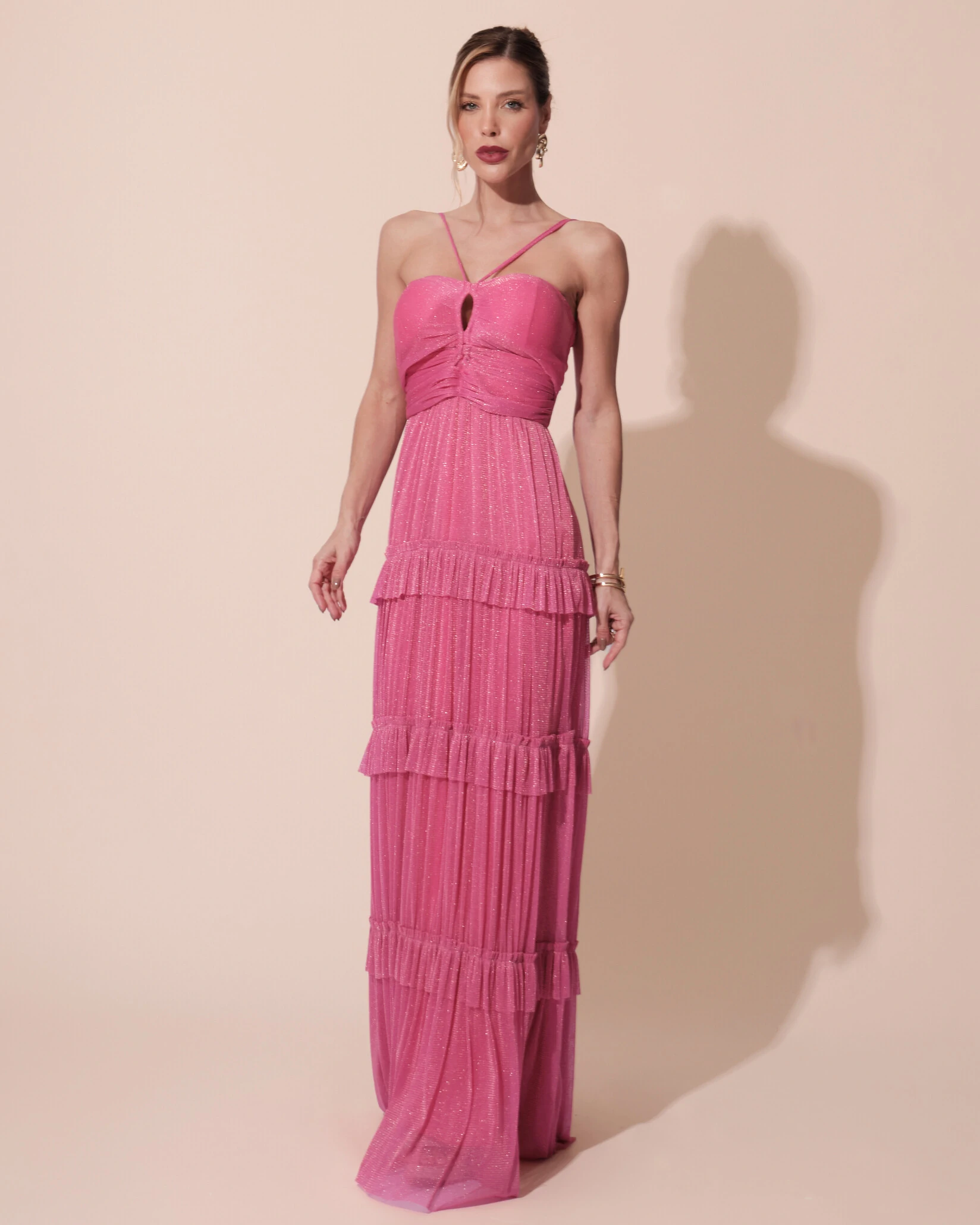 VESTIDO DE FESTA LONGO TULE SAIA BABADO - Este vestido de festa em tule brilhante, com opção de alça removível, é perfeito para uma variedade de ocasiões especiais. É ideal para casamentos, bailes de formatura, festas de gala e jantares requintados. Sua versatilidade permite que você adapte o estilo conforme a ocasião, combinando-o com acessórios sofisticados e sapatos de salto alto para um look completo e elegante.