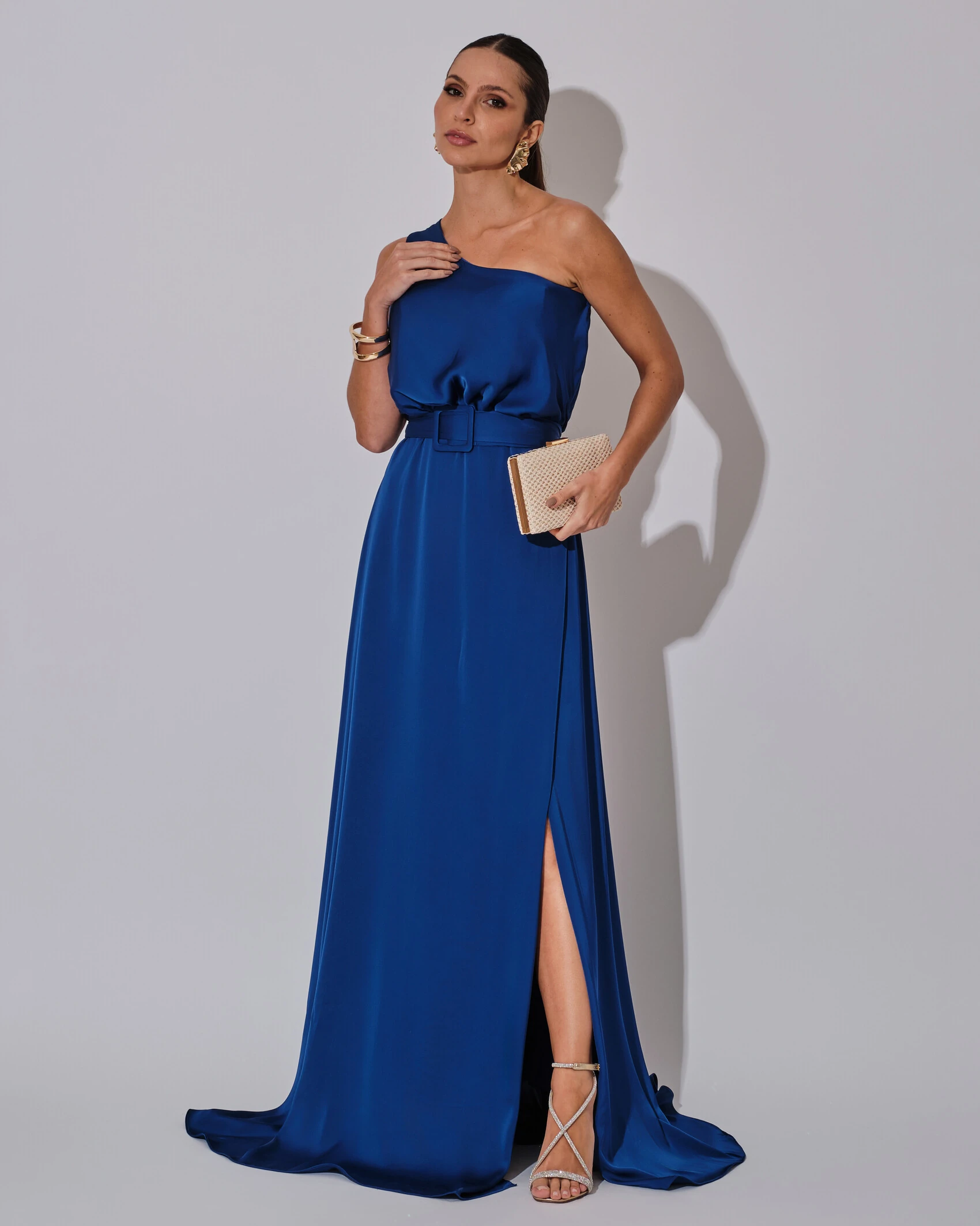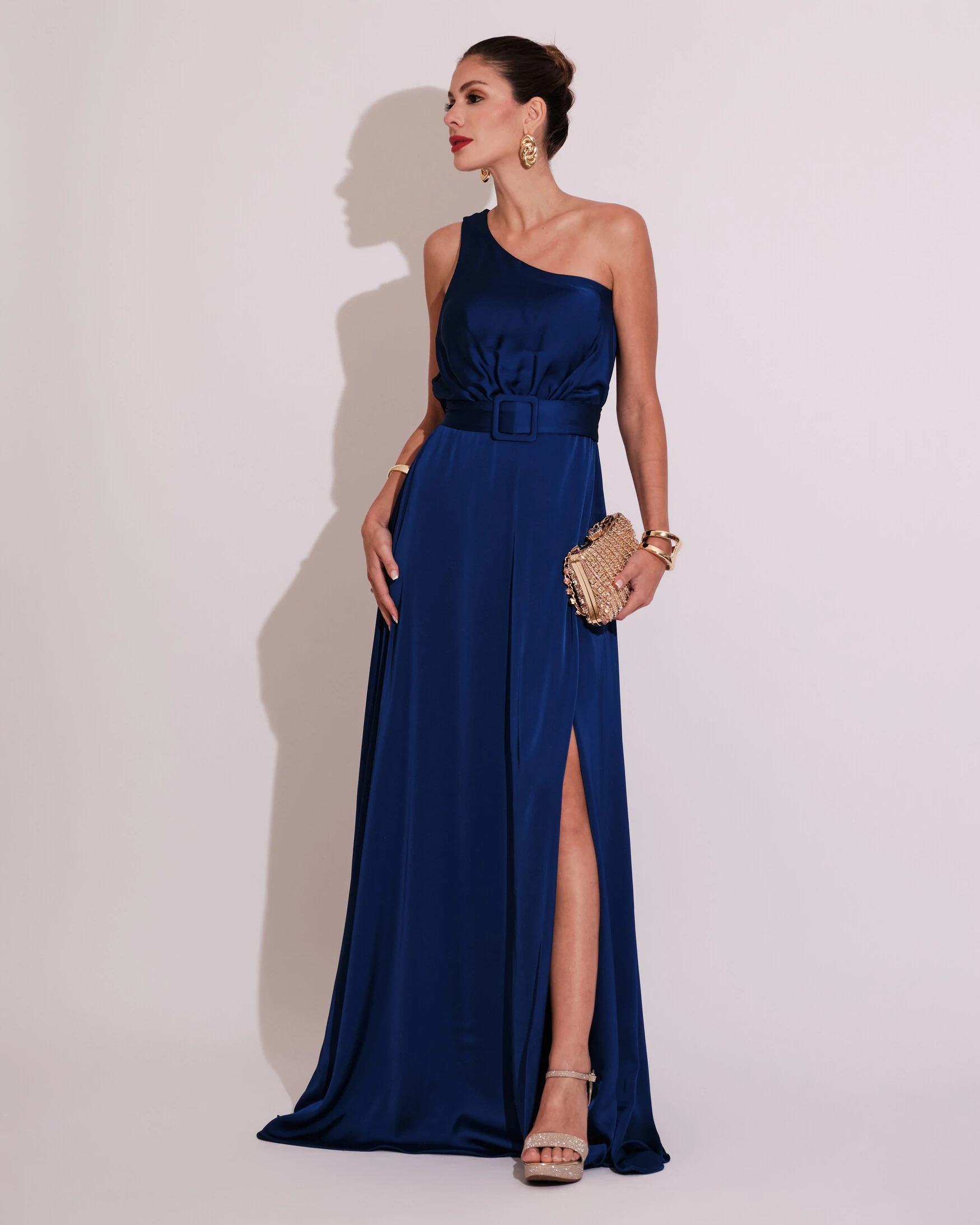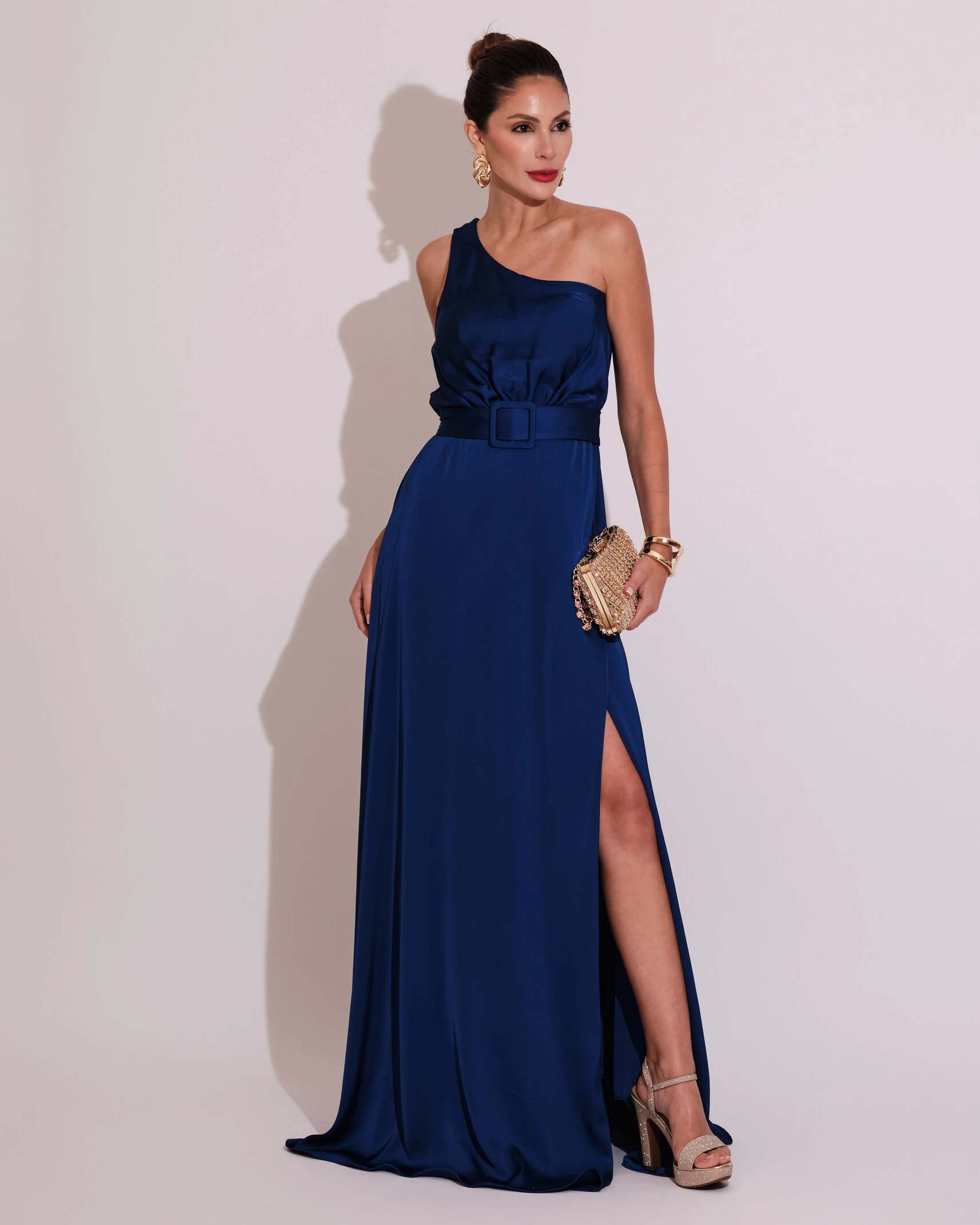 Vestido longo um ombro só, com cinto fivela forrada quadrada. Tecido possui textura acetinada (Cetim viscose), modelagem fluida, leve e solta! Possui zíper na lateral , saia reta e decote em V.