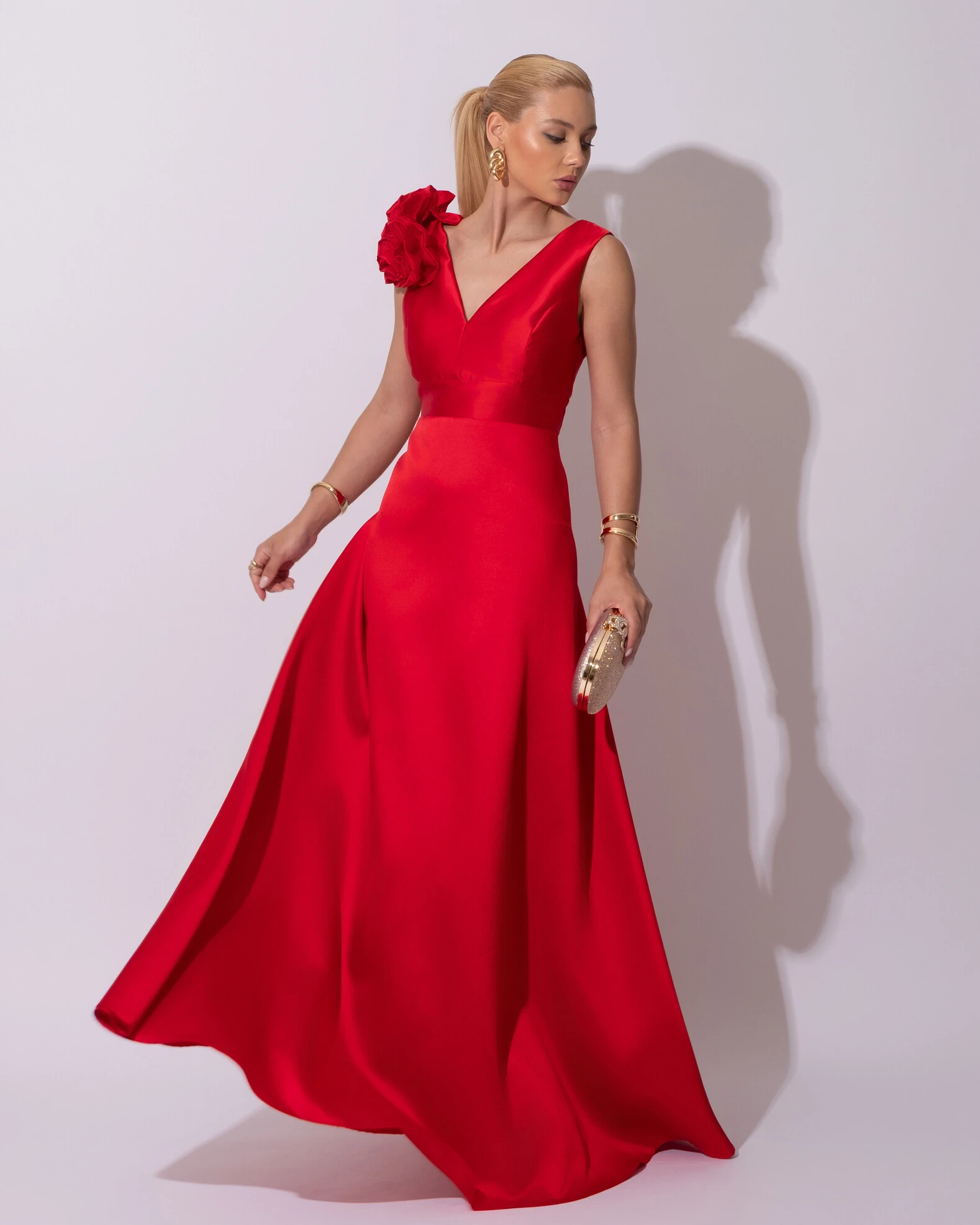 Vestido de Festa longo Zibeline Decote em V com Flores Removivel Vermelho