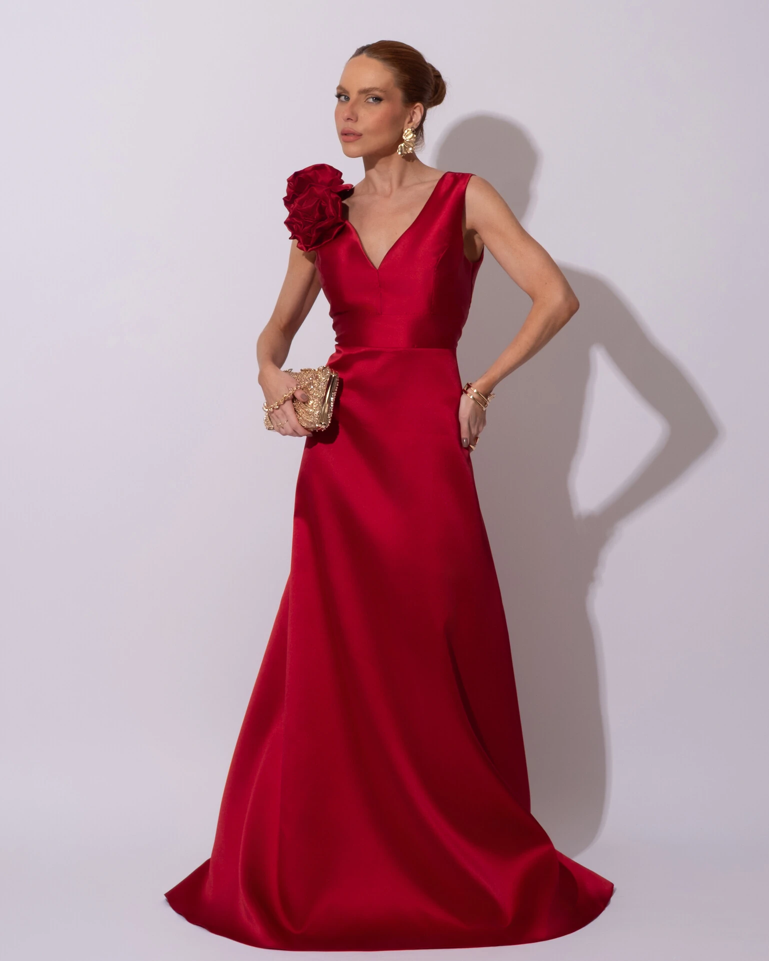 VESTIDO DE FESTA LONGO ZIBELINE DECOTE EM V  COM FLORES REMOVIVEL- Deslumbre-se com este elegante vestido de festa confeccionado em zibeline, que reflete a luz de forma sofisticada. Com um corte impecável que valoriza a silhueta, o vestido apresenta um decote delicado e um toque romântico. A saia flui graciosamente até o chão, proporcionando um caimento deslumbrante a cada passo.