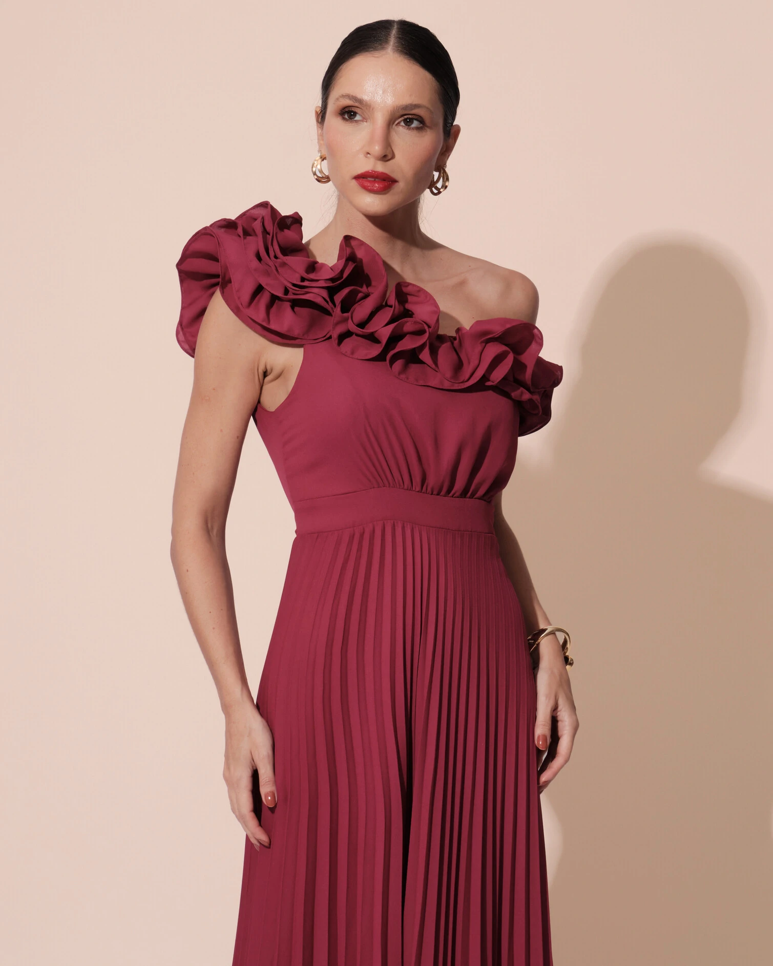 Vestido de Festa um Ombro Só Flor Saia Plissado Cereja