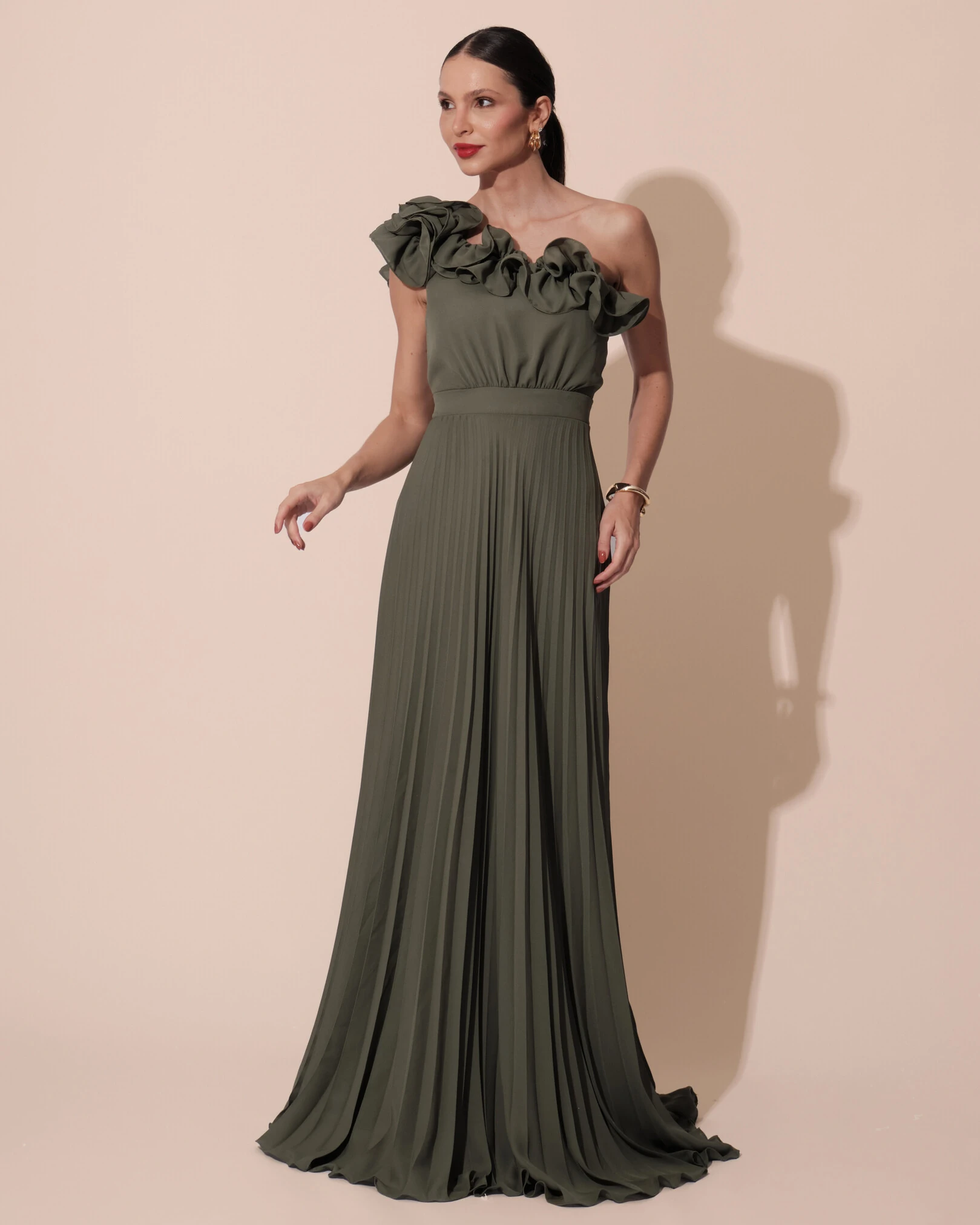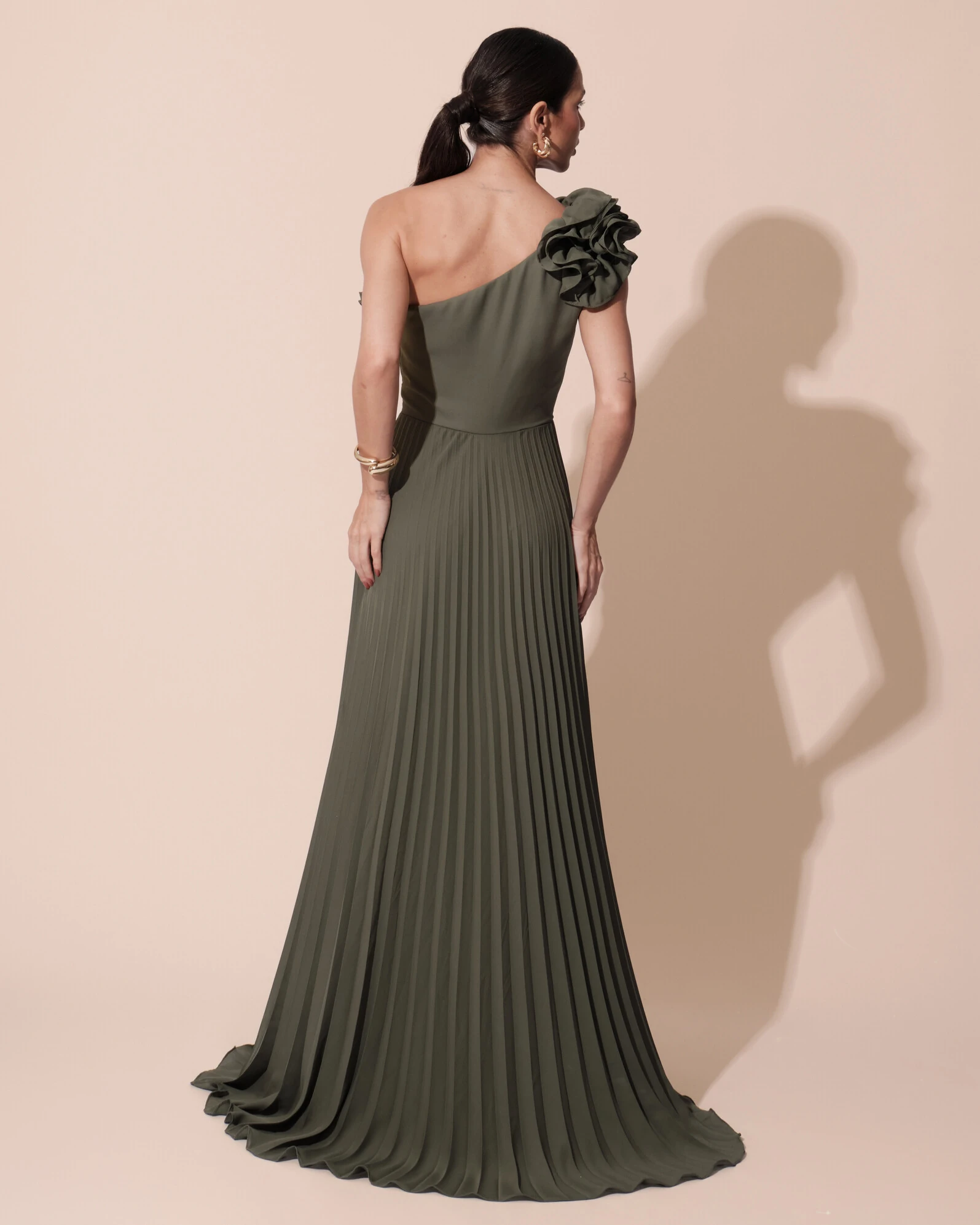 VESTIDO DE FESTA UM OMBRO SÓ FLOR PLISSADO - Vestido super moderno e elegante para usar em ocasiões especiais! Sua catarterística principal é o charme da flor no busto e sua saia fluida plissada!