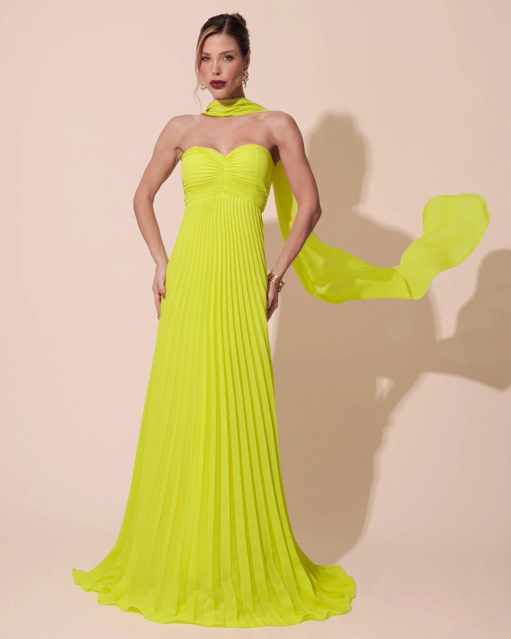VESTIDO DE FESTA LONGO TOMARA QUE CAIA PLISSADO COM LENÇO - Este vestido longo de festa tomara que caia com saia plissada é perfeito para ocasiões elegantes, como casamentos, galas ou eventos formais ao entardecer. Sua modelagem clássica e fluida traz sofisticação, enquanto a saia plissada oferece movimento e leveza, ideal para ocasiões que pedem um toque de glamour. O lenço, que pode ser usado de diversas formas, adiciona um charme extra, tornando o vestido ainda mais versátil para diferentes tipos de celebrações, seja em ambientes internos ou ao ar livre.