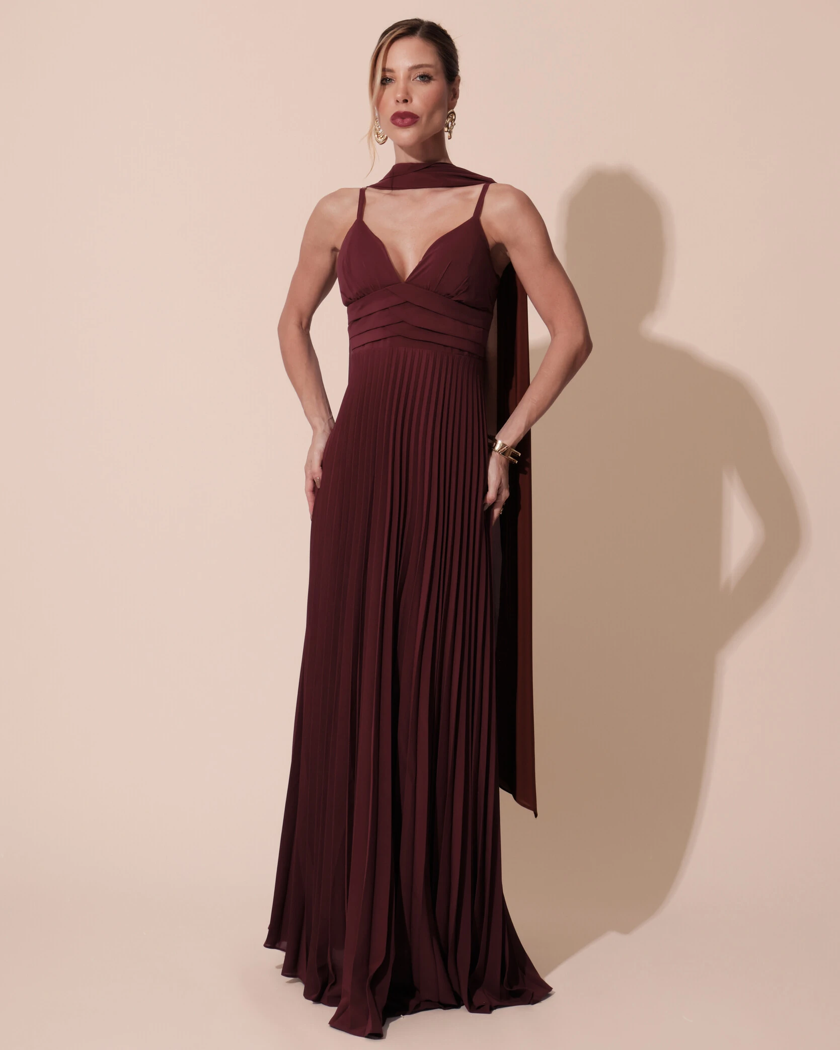 Vestido de Festa Longo Plissado Crepe Chiffon com Alça e Lenço Marsala