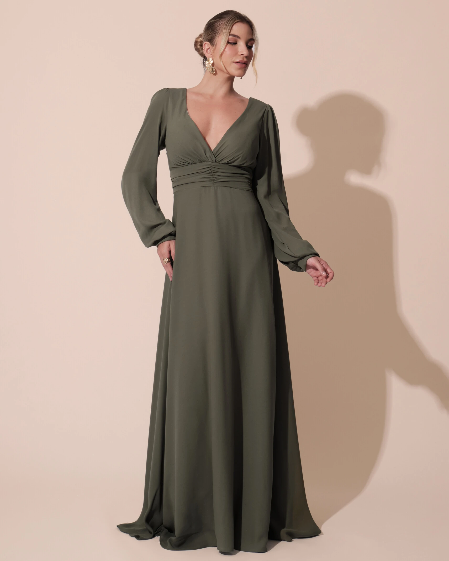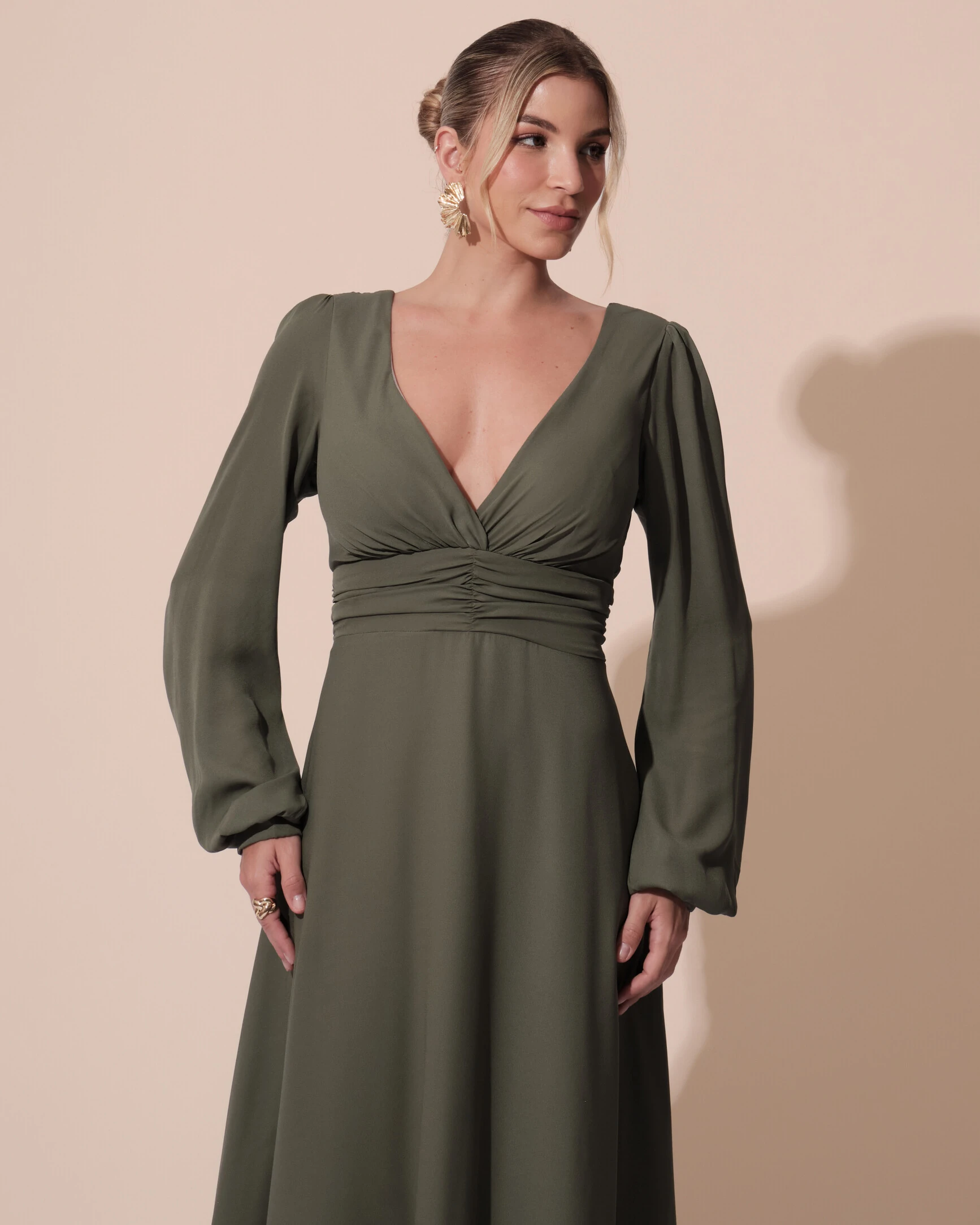 VESTIDO DE FESTA MANGA LONGA COM CINTURA DRAPEADO DECOTE V- Este deslumbrante vestido de festa em crepe é uma escolha sofisticada para qualquer ocasião especial. Com mangas longas delicadamente ajustadas, ele traz elegância e estilo, perfeito para eventos noturnos ou formais. A cintura drapeada proporciona um caimento perfeito, criando uma silhueta esbelta e feminina. O decote em V adiciona um toque de sensualidade sutil, equilibrando perfeitamente com a fluidez do tecido crepe. O design simples, mas refinado, exalta a beleza clássica e atemporal, tornando este vestido uma peça-chave para quem busca um visual moderno e elegante, com sofisticação e conforto.