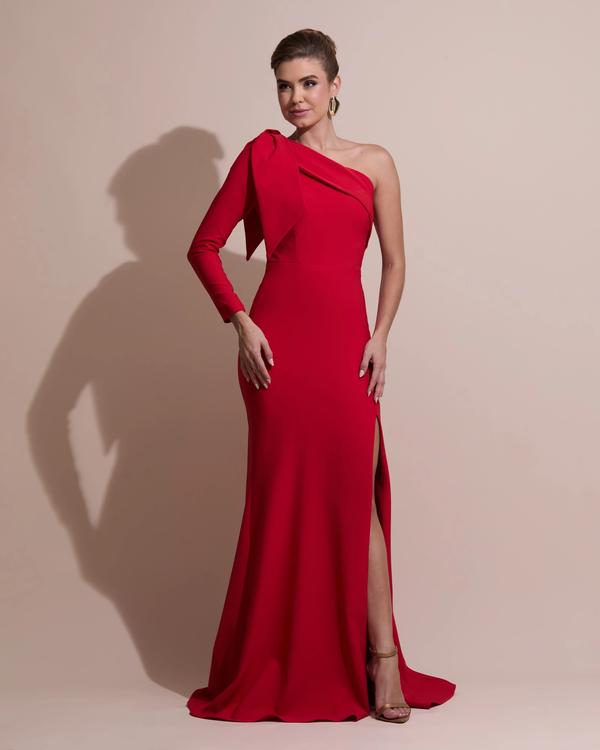 VESTIDO DE FESTA COM LAÇO DE UM OMBRO EM ALFAIATARIA FENDA - Este deslumbrante vestido de festa em alfaiataria traz um equilíbrio perfeito entre sofisticação e ousadia. Confeccionado em tecido nobre e estruturado, ele se destaca pela sua elegância atemporal e pelo design arrojado.
