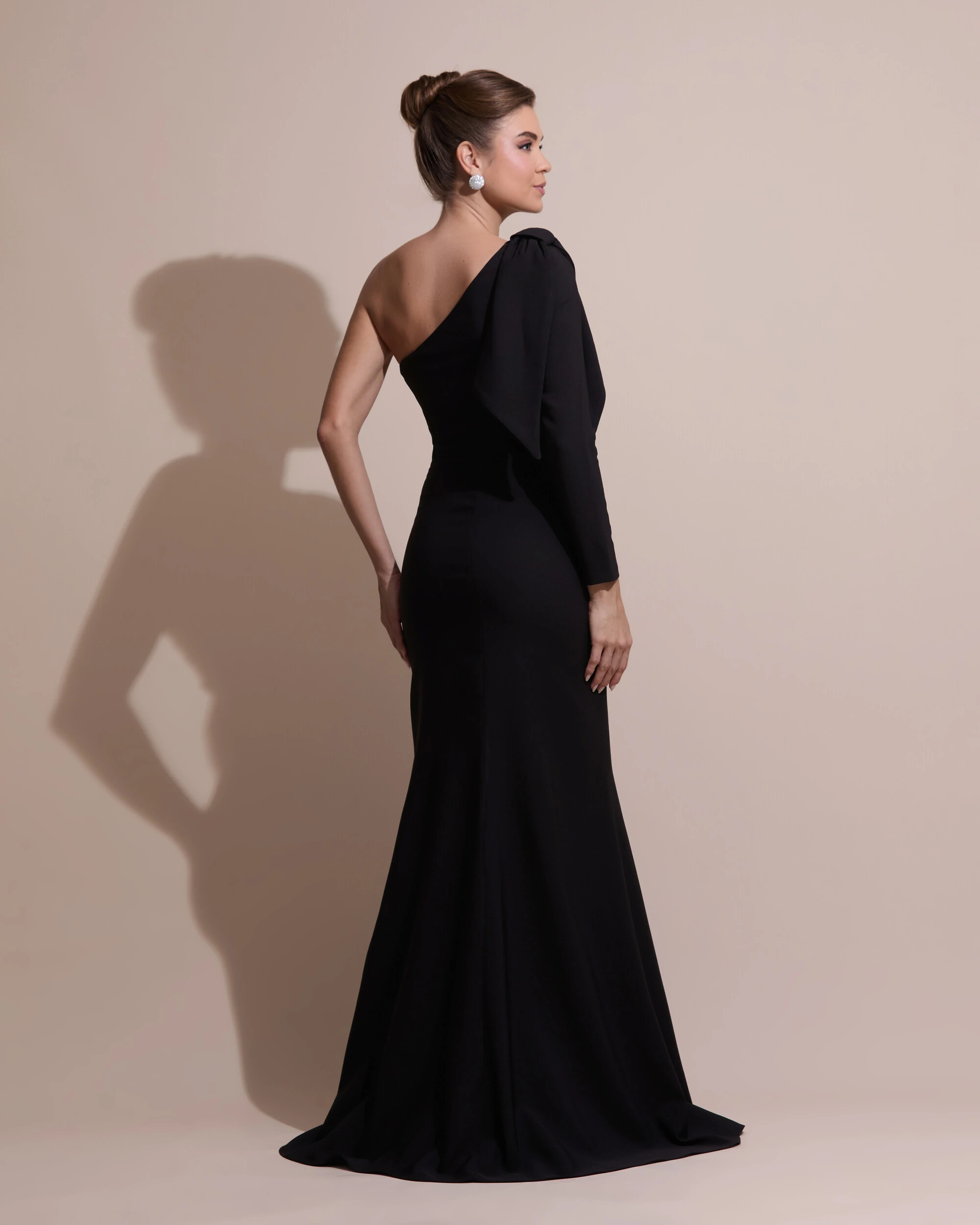 A peça possui um corte reto e impecável, que se ajusta suavemente ao corpo, proporcionando uma silhueta longa e esbelta. O detalhe de um único ombro, com um delicado laço amarrado, adiciona um toque de romantismo e modernidade, criando uma assimetria que é ao mesmo tempo sensual e refinada.
