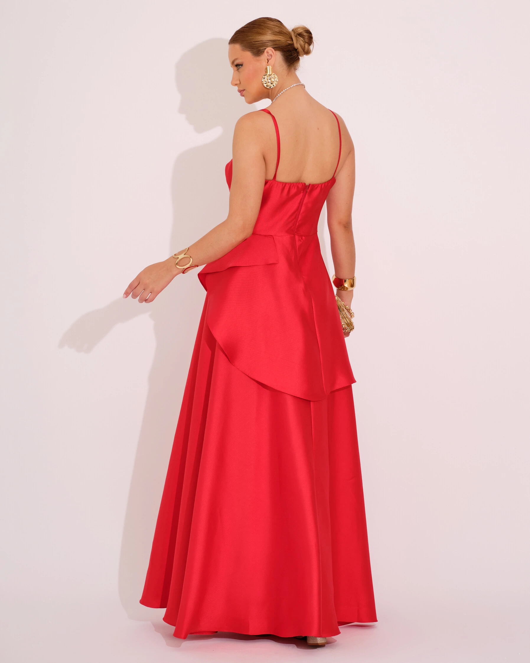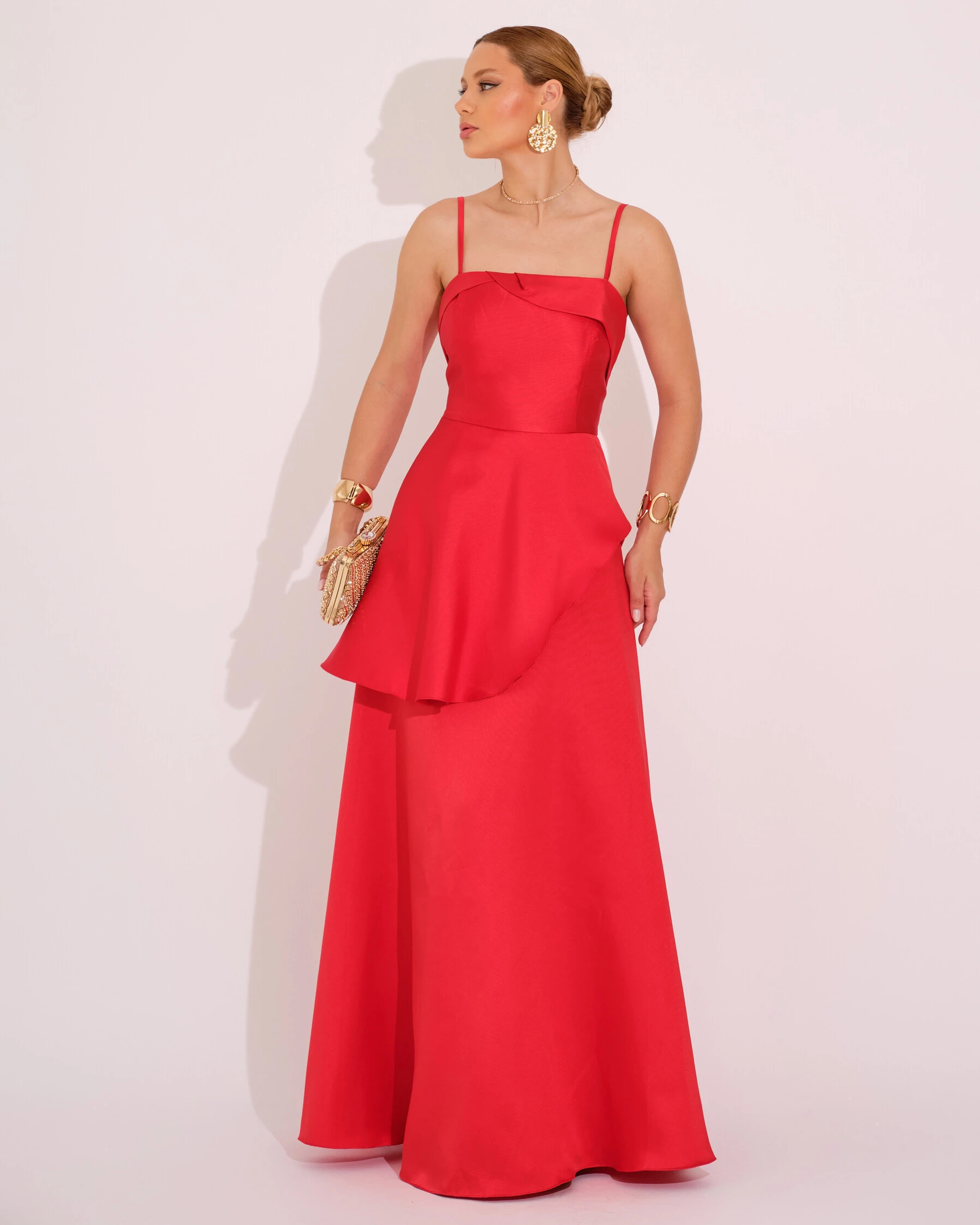 Com sua combinação de recortes refinados e a fluidez das camadas, este vestido é uma opção ideal para eventos de gala, casamentos e festas exclusivas, garantindo que quem o use seja o centro das atenções, com um look que transborda classe e estilo.