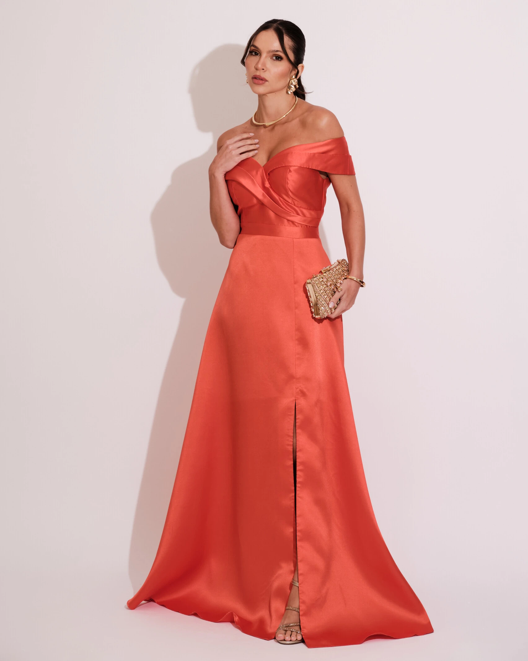 Vestido de Festa Longo Zibeline Ombro a Ombro com Fenda Laranja