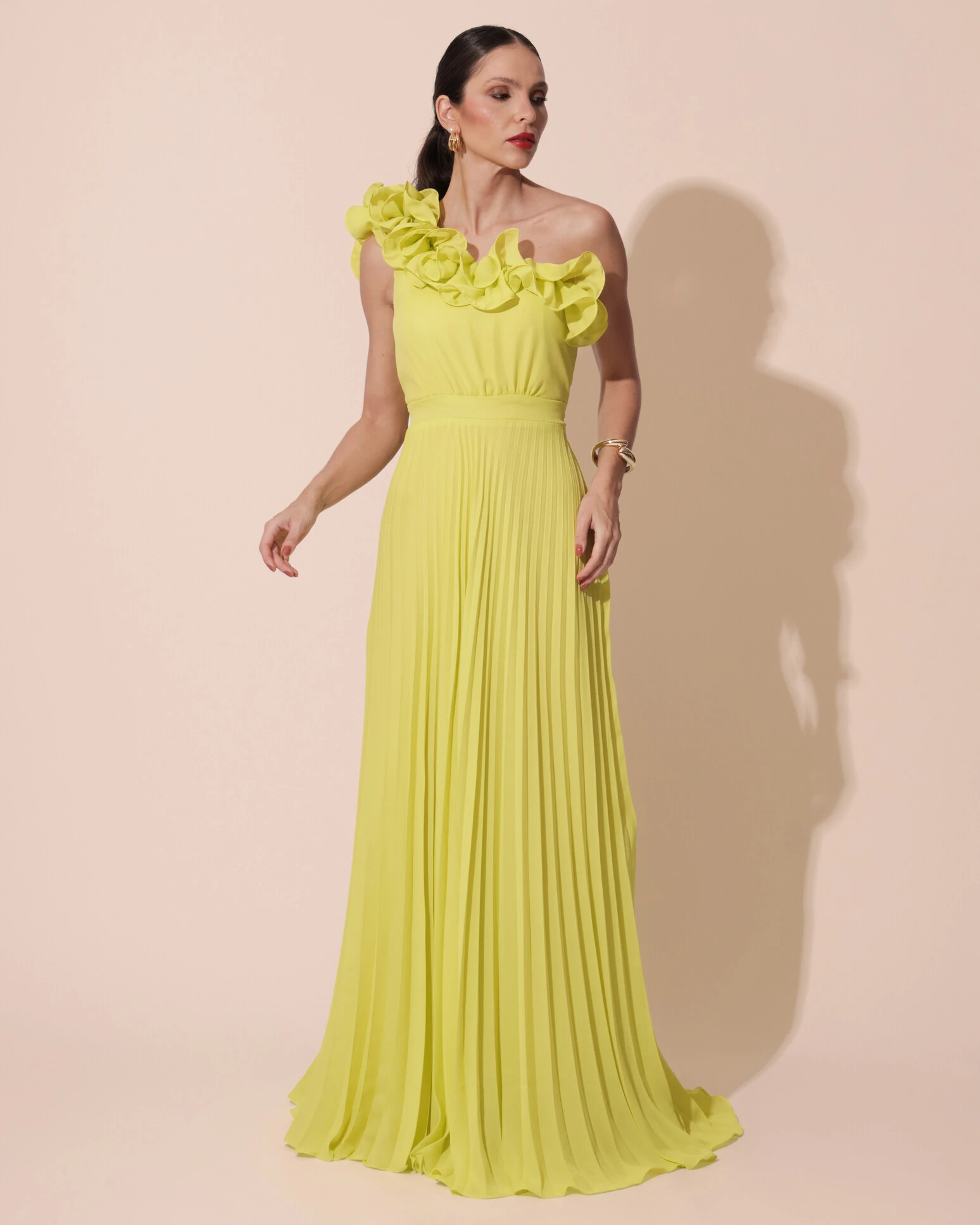 VESTIDO DE FESTA UM OMBRO SÓ FLOR PLISSADO - Vestido super moderno e elegante para usar em ocasiões especiais! Sua catarterística principal é o charme da flor no busto e sua saia fluida plissada!