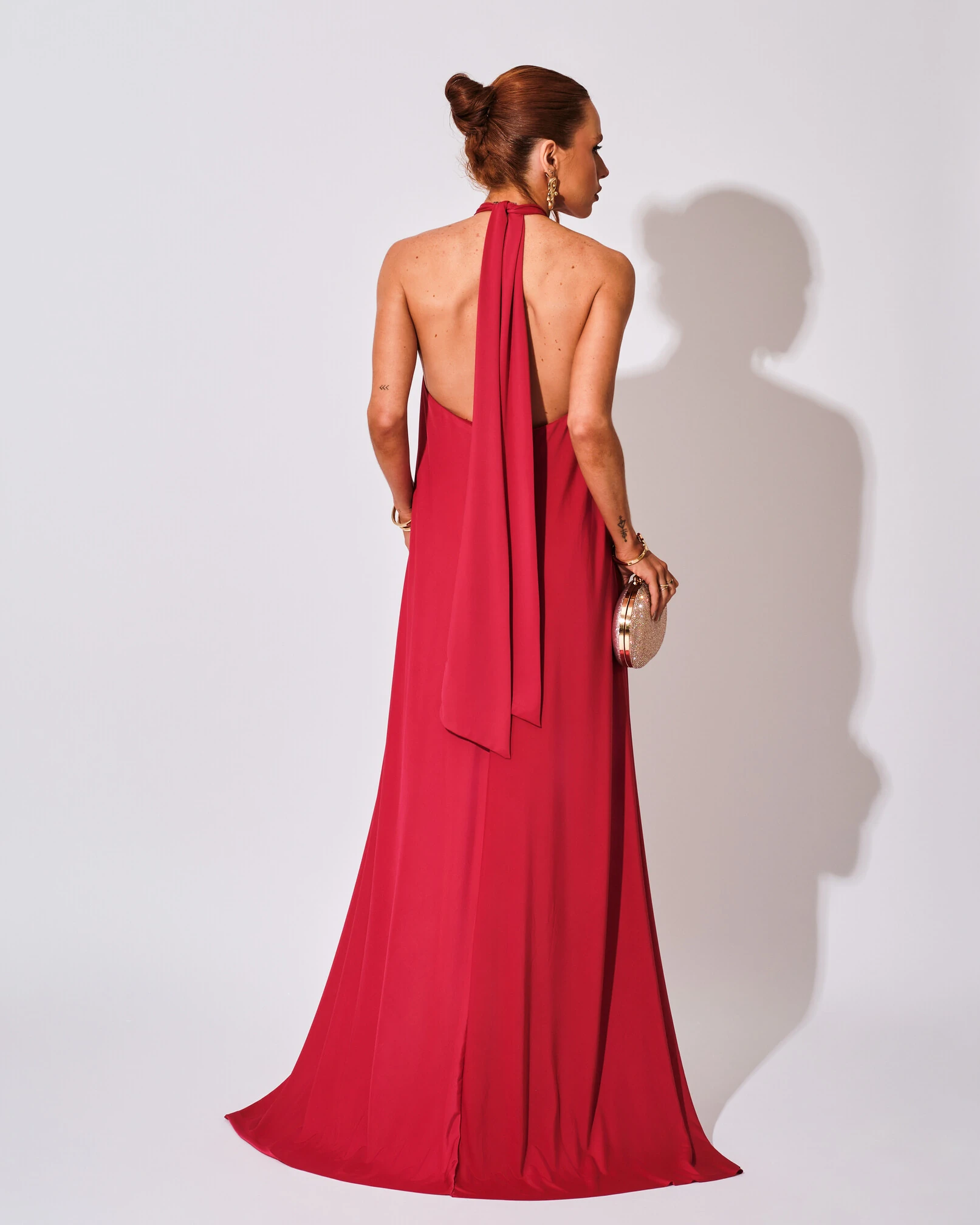 Vestido de festa longo, tem caimento super fluido e reto, com decote triangular em seu busto, e, nas costas segue com um recorte profundo.