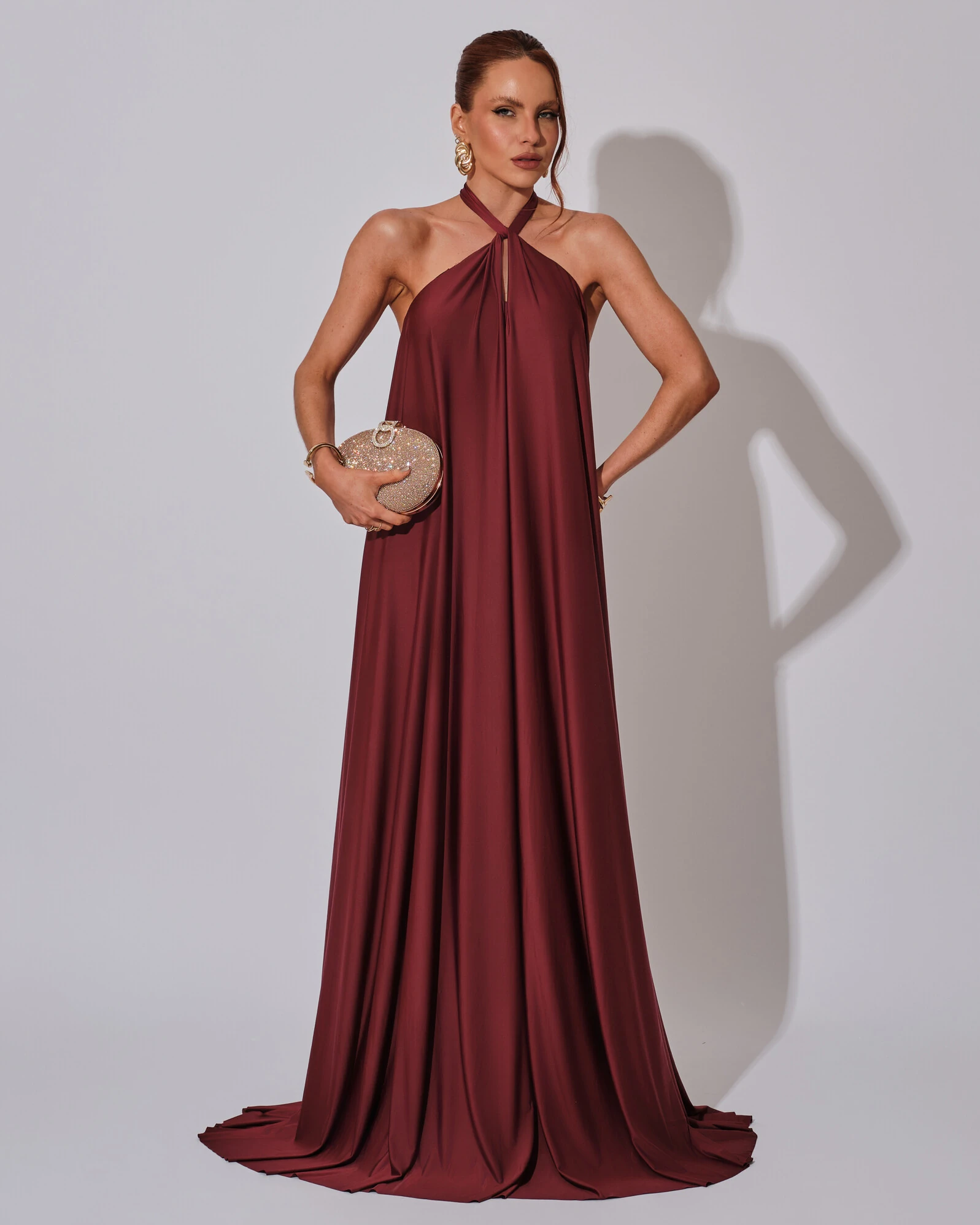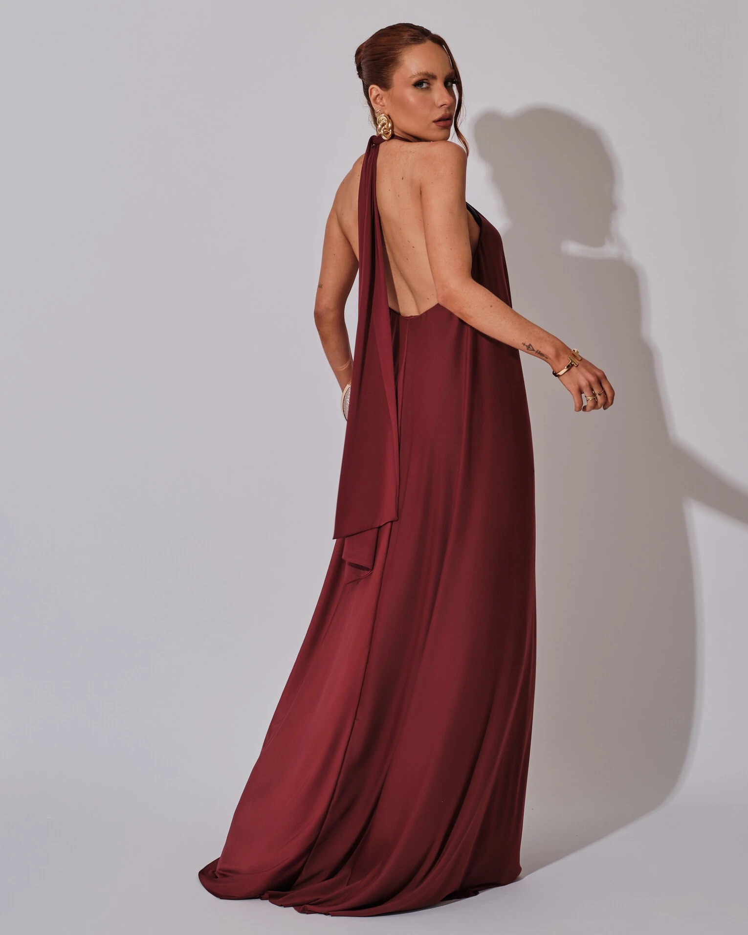 Vestido de festa longo, tem caimento super fluido e reto, com decote triangular em seu busto, e, nas costas segue com um recorte profundo.