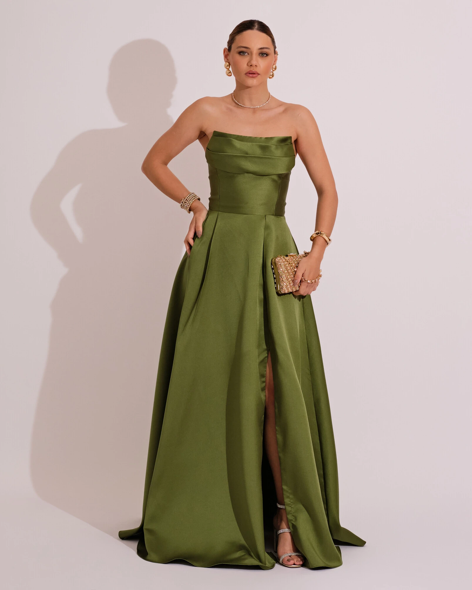 VESTIDO DE FESTA LONGO TOMARA QUE CAIA TRANÇADO COSTA EM ZIBELINE - O vestido de festa longo tomara que caia com trançado nas costas, confeccionado em zibeline, é a escolha perfeita para quem busca sofisticação com um toque de sensualidade discreta. Seu caimento estruturado valoriza a silhueta, enquanto o detalhe trançado nas costas acrescenta charme e originalidade ao look. Ideal para casamentos noturnos, formaturas ou eventos de gala, ele pode ser combinado com brincos statement, clutch metálica e sandálias de salto fino. Para completar o visual, um penteado preso valoriza o decote e destaca o trançado, tornando o look ainda mais impactante em ambientes como salões luxuosos, espaços ao ar livre elegantes ou festas em hotéis refinados.