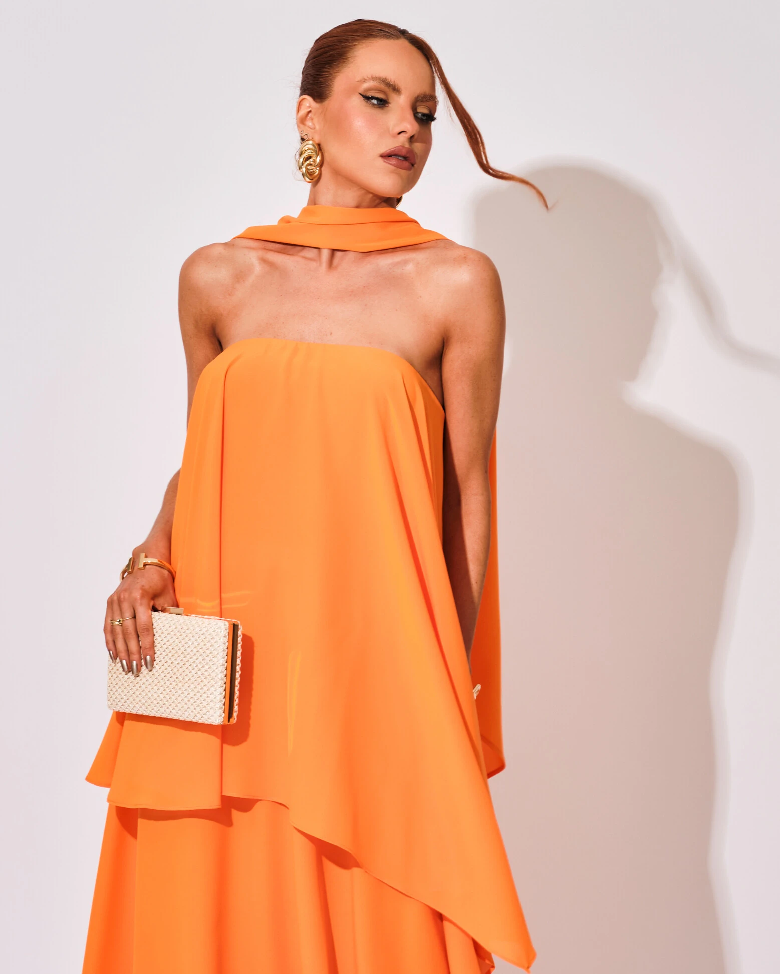 VESTIDO DE FESTA LONGO CHIFFON CREPE EM CAMADAS COM LENÇO - Este vestido longo de modelagem fluida apresenta camadas assimétricas que conferem movimento e leveza, perfeito para eventos ao ar livre como casamentos na praia, festas em jardins ou celebrações diurnas. Seu caimento solto garante conforto sem perder a elegância, e ele pode ser combinado com sandálias de salto fino ou bloco, clutch vibrante para um toque de contraste e joias delicadas como brincos médios ou argolas finas. Um penteado solto com ondas suaves ou preso baixo valoriza ainda mais o visual, transmitindo um charme sofisticado e natural.