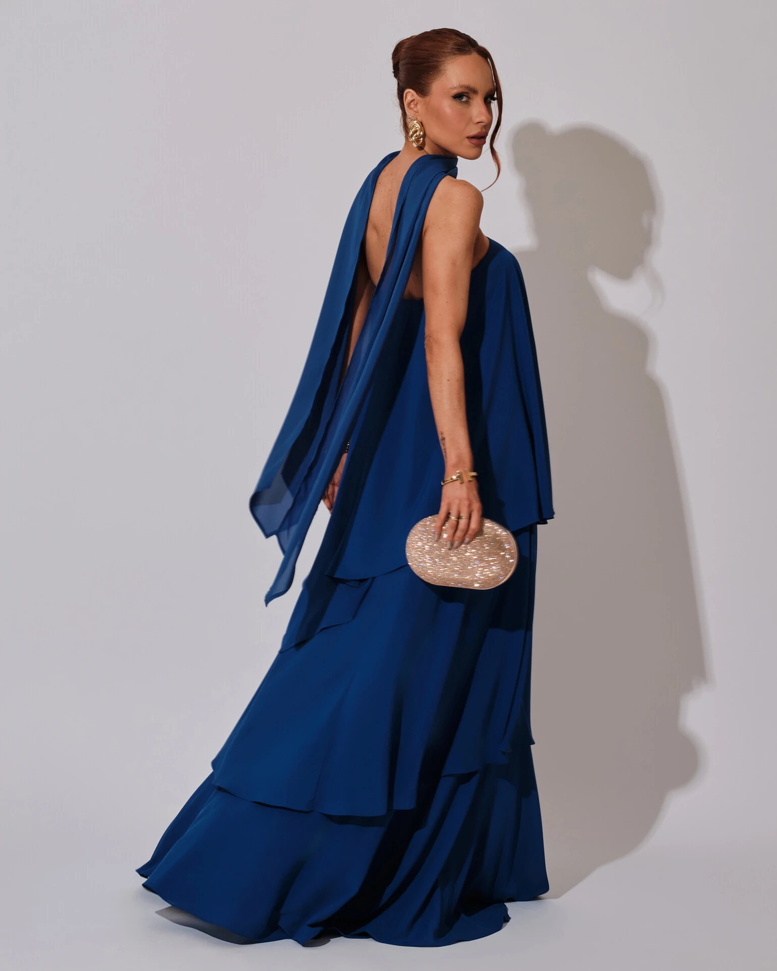 VESTIDO DE FESTA LONGO CHIFFON CREPE EM CAMADAS COM LENÇO - Este vestido longo de modelagem fluida apresenta camadas assimétricas que conferem movimento e leveza, perfeito para eventos ao ar livre como casamentos na praia, festas em jardins ou celebrações diurnas. Seu caimento solto garante conforto sem perder a elegância, e ele pode ser combinado com sandálias de salto fino ou bloco, clutch vibrante para um toque de contraste e joias delicadas como brincos médios ou argolas finas. Um penteado solto com ondas suaves ou preso baixo valoriza ainda mais o visual, transmitindo um charme sofisticado e natural.