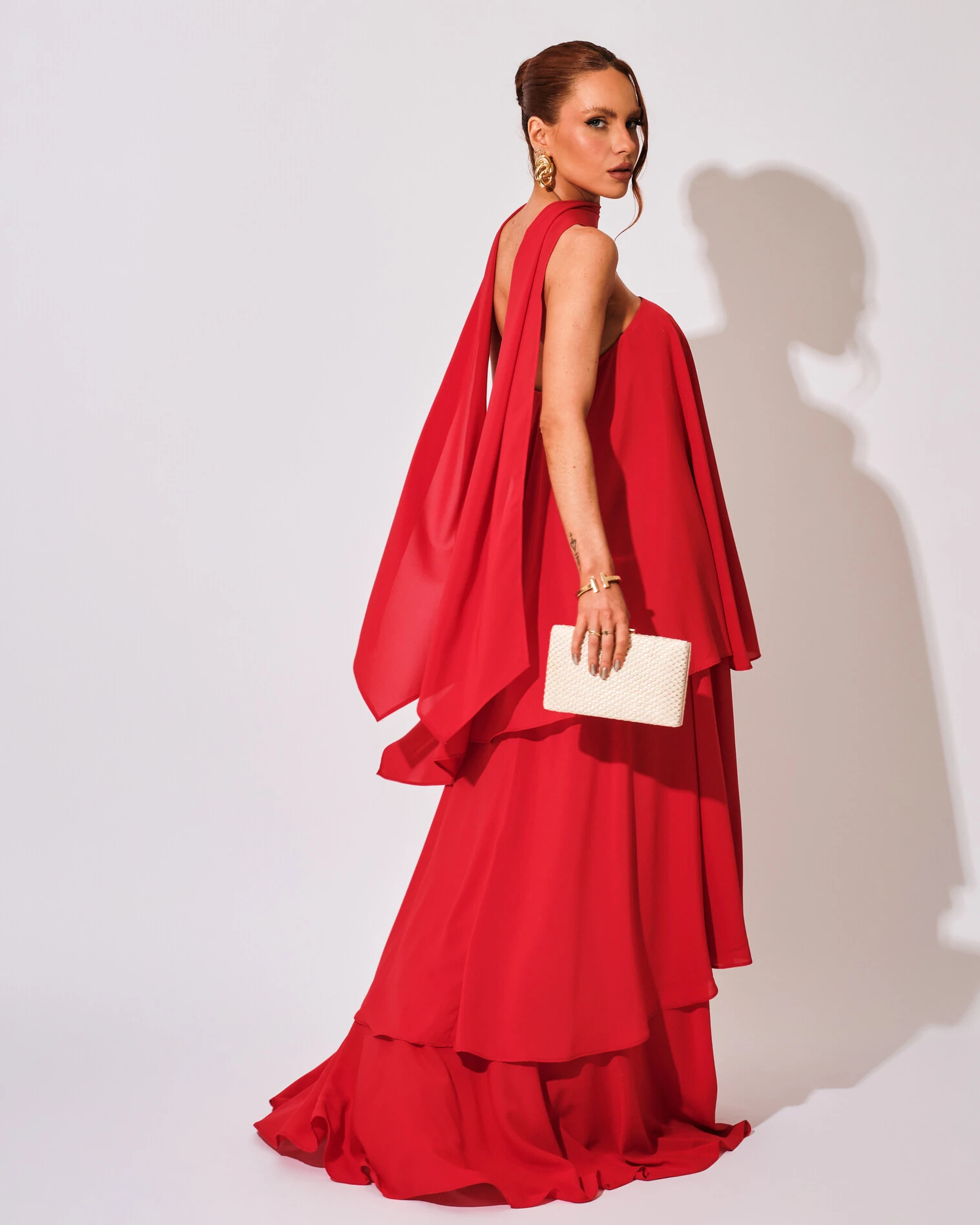 VESTIDO DE FESTA LONGO CHIFFON CREPE EM CAMADAS COM LENÇO - Este vestido longo de modelagem fluida apresenta camadas assimétricas que conferem movimento e leveza, perfeito para eventos ao ar livre como casamentos na praia, festas em jardins ou celebrações diurnas. Seu caimento solto garante conforto sem perder a elegância, e ele pode ser combinado com sandálias de salto fino ou bloco, clutch vibrante para um toque de contraste e joias delicadas como brincos médios ou argolas finas. Um penteado solto com ondas suaves ou preso baixo valoriza ainda mais o visual, transmitindo um charme sofisticado e natural.