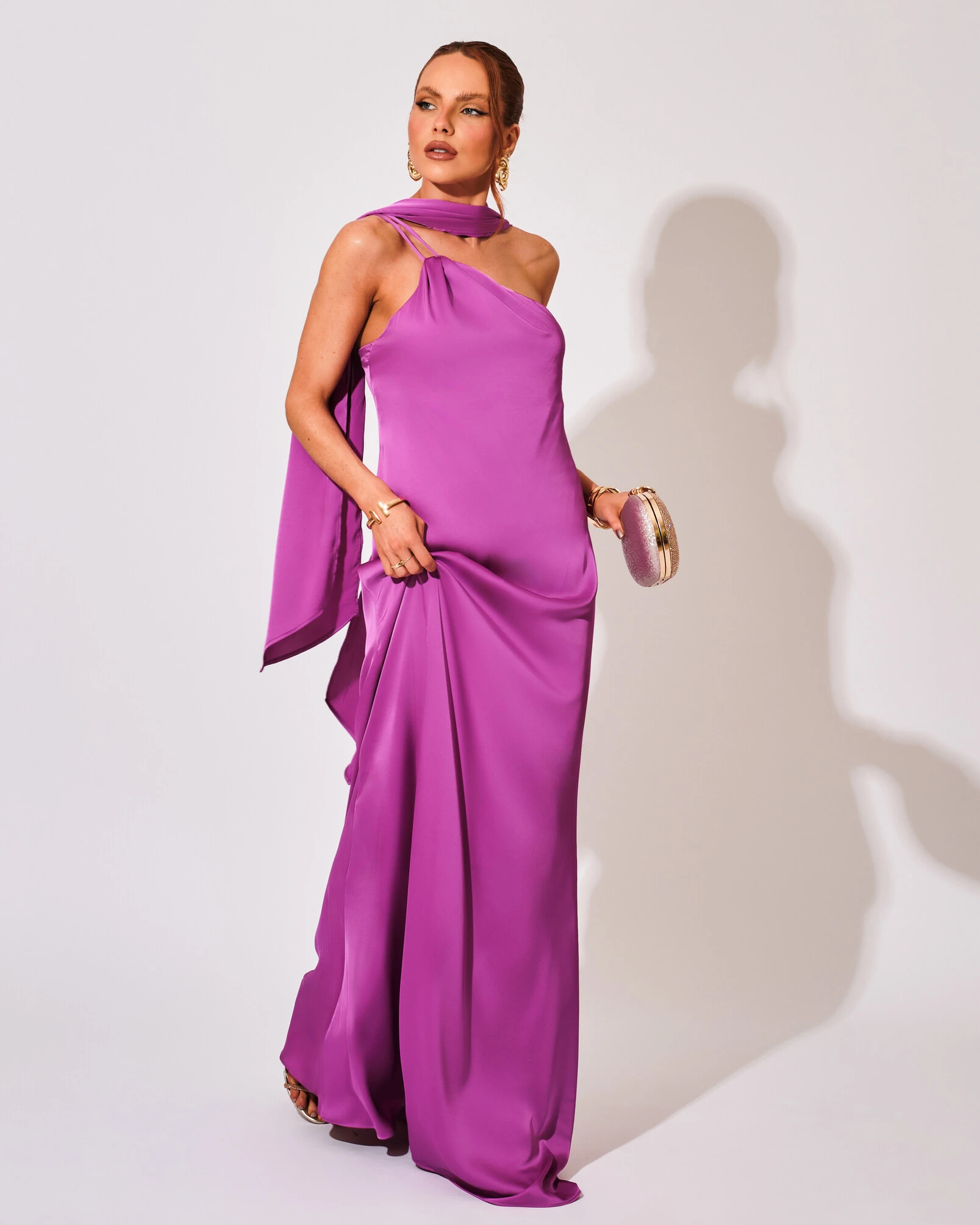VESTIDO DE FESTA LONGO EM CETIM FLUIDO UM OMBRO SÓ COM LENÇO - O vestido longo de cetim um ombro só é a escolha ideal para quem busca elegância minimalista em festas sofisticadas, casamentos, formaturas e eventos noturnos. Sua modelagem fluida valoriza a silhueta com caimento impecável, enquanto o detalhe do ombro único garante modernidade e charme atemporal. Combine-o com clutch metalizada, joias douradas e um salto fino para um visual marcante. Perfeito para madrinhas, convidadas de casamento na praia ou salão, jantares de gala e celebrações especiais, este vestido une sofisticação e versatilidade em uma peça única.