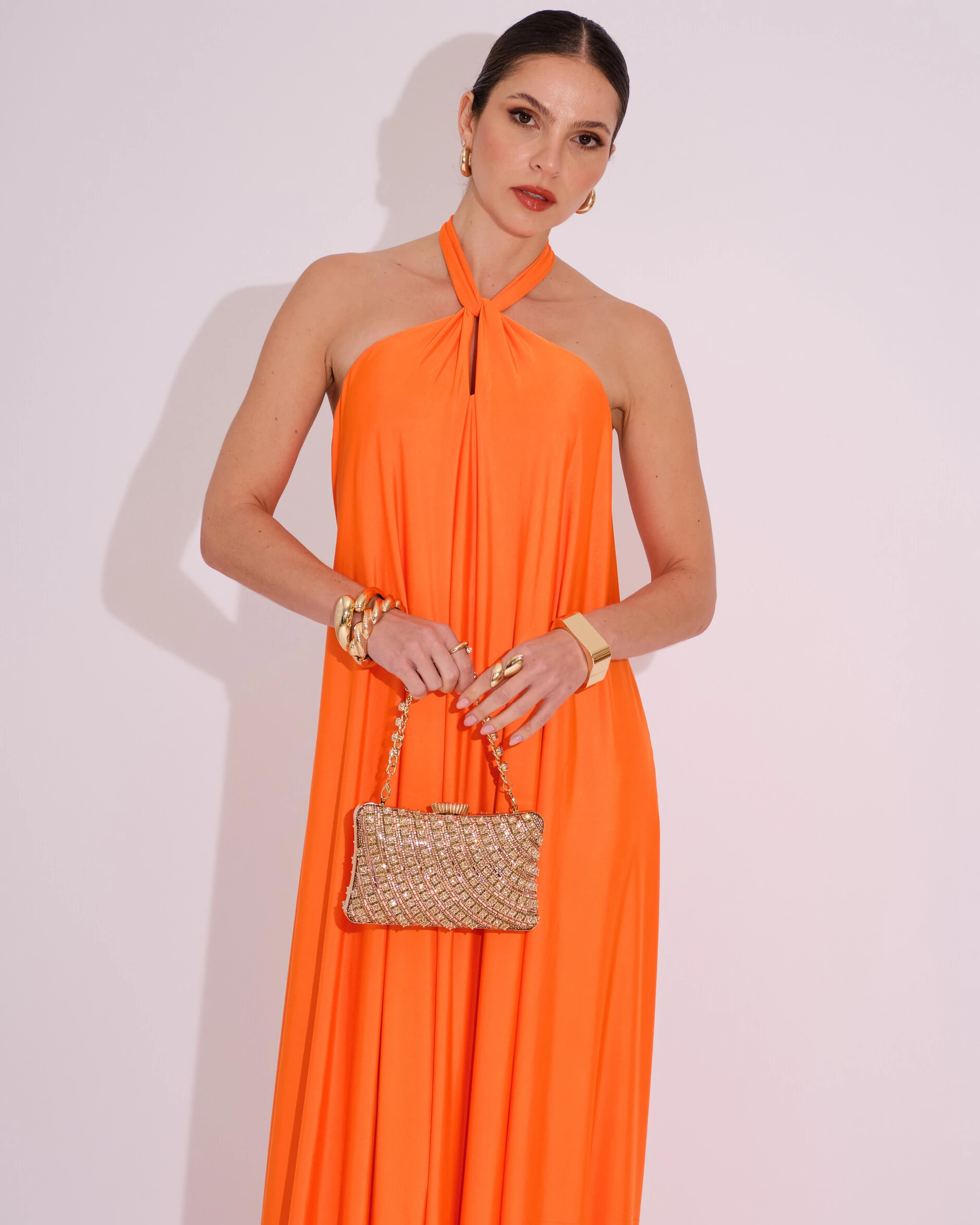 Vestido de festa longo, tem caimento super fluido e reto, com decote triangular em seu busto, e, nas costas segue com um recorte profundo.
