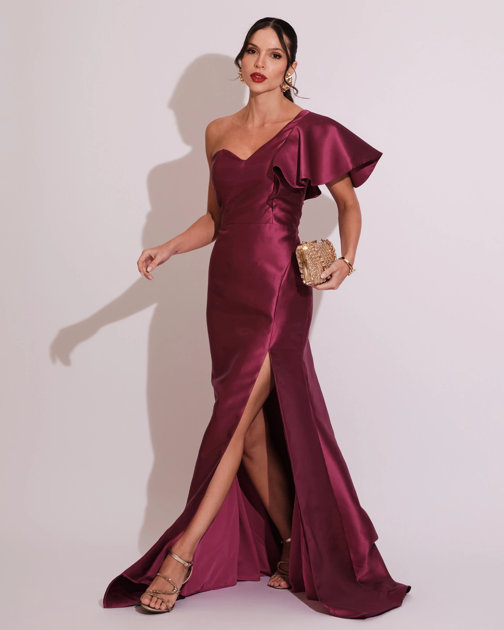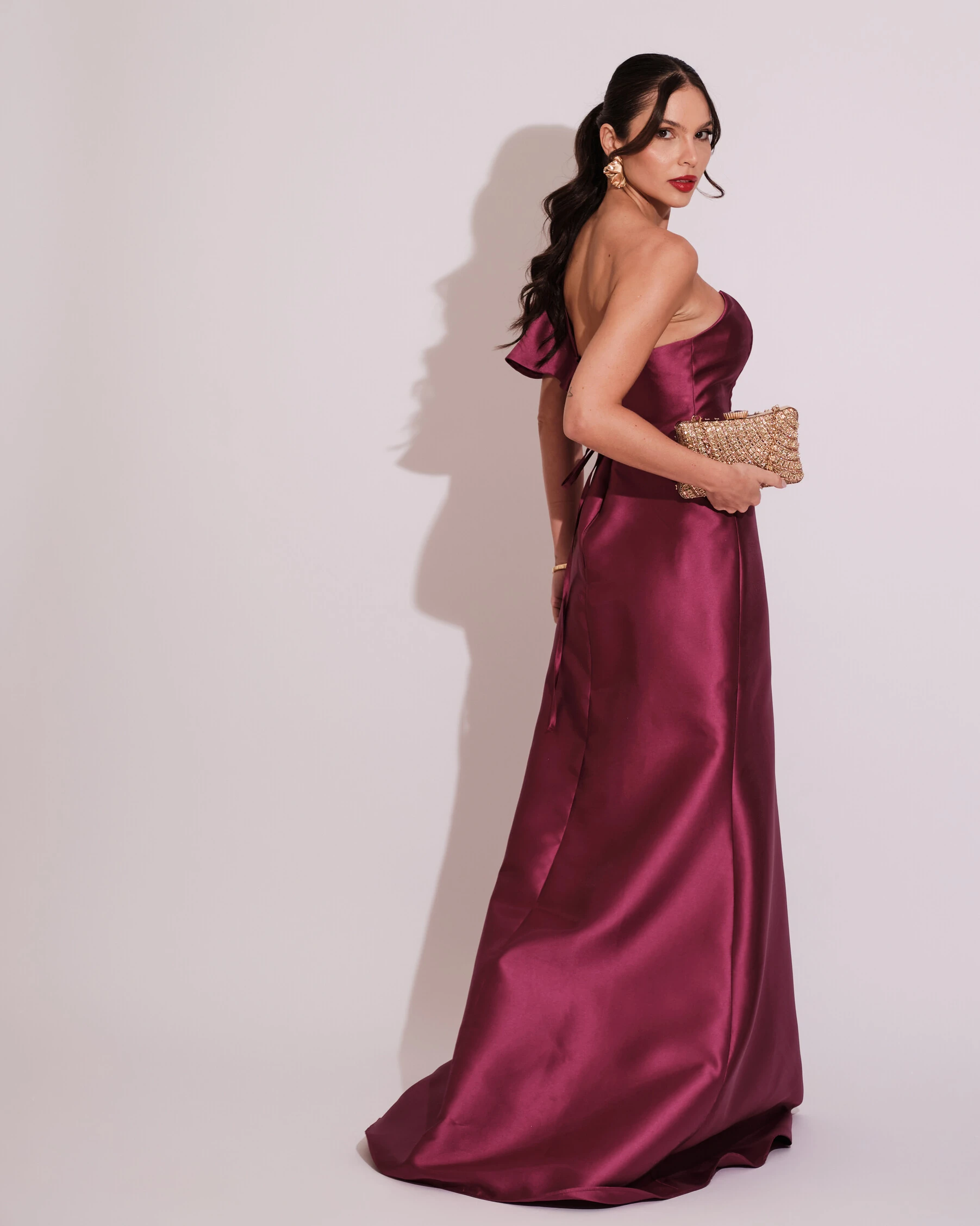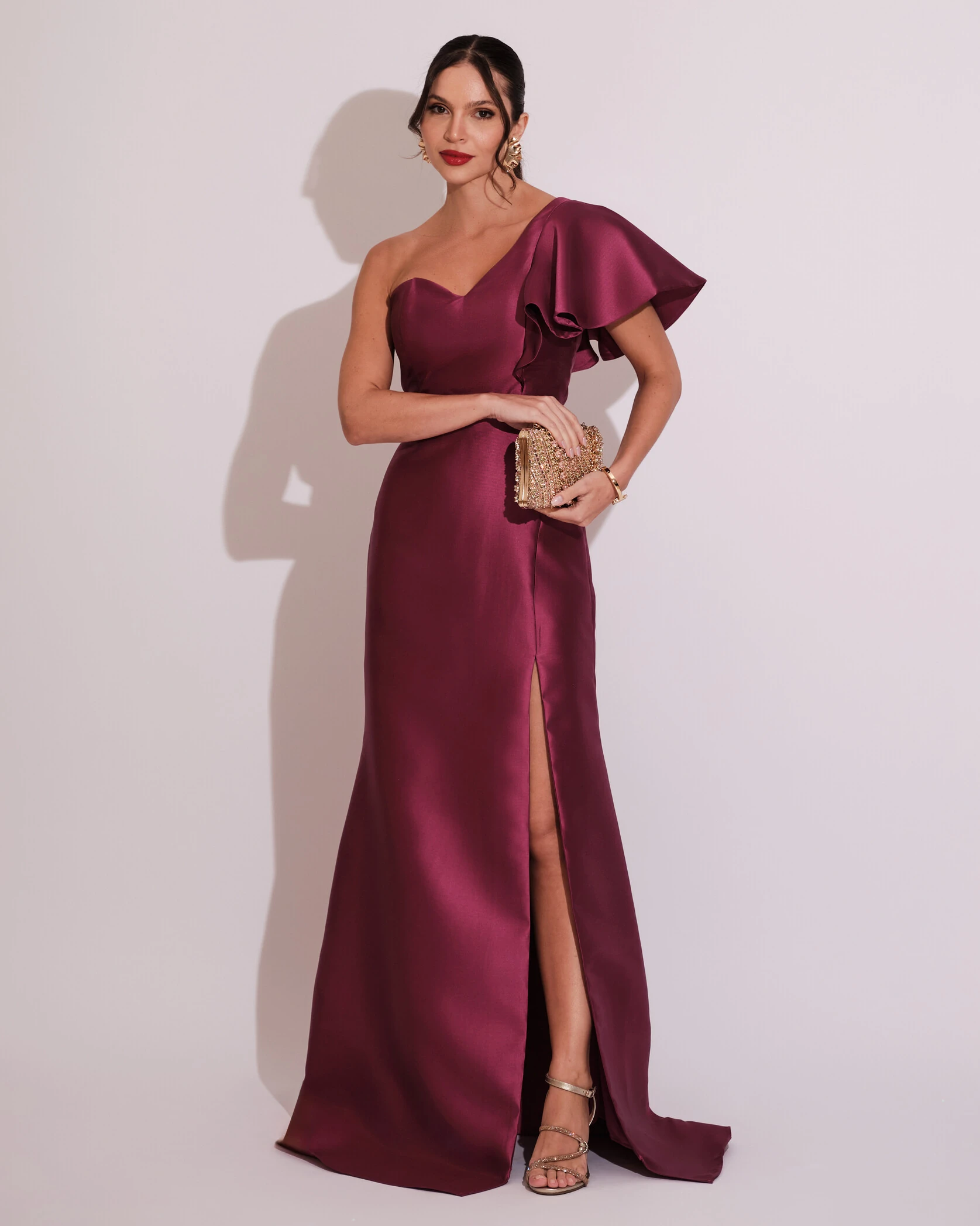 VESTIDO DE FESTA LONGO UM OMBRO BABADO TOMARA QUE CAIA ZIBELINE - Elegante e imponente, o vestido de festa longo em zibeline com um ombro só e babado em estilo tomara que caia é a escolha perfeita para quem deseja se destacar com sofisticação. A estrutura do tecido valoriza a silhueta, enquanto o detalhe assimétrico do babado adiciona um toque moderno e dramático. Ideal para casamentos noturnos, formaturas e eventos de gala, ele combina perfeitamente com brincos longos e pulseiras marcantes — evitando colares para valorizar o decote. Complete o look com uma clutch metalizada e sandálias de salto fino para um visual inesquecível.