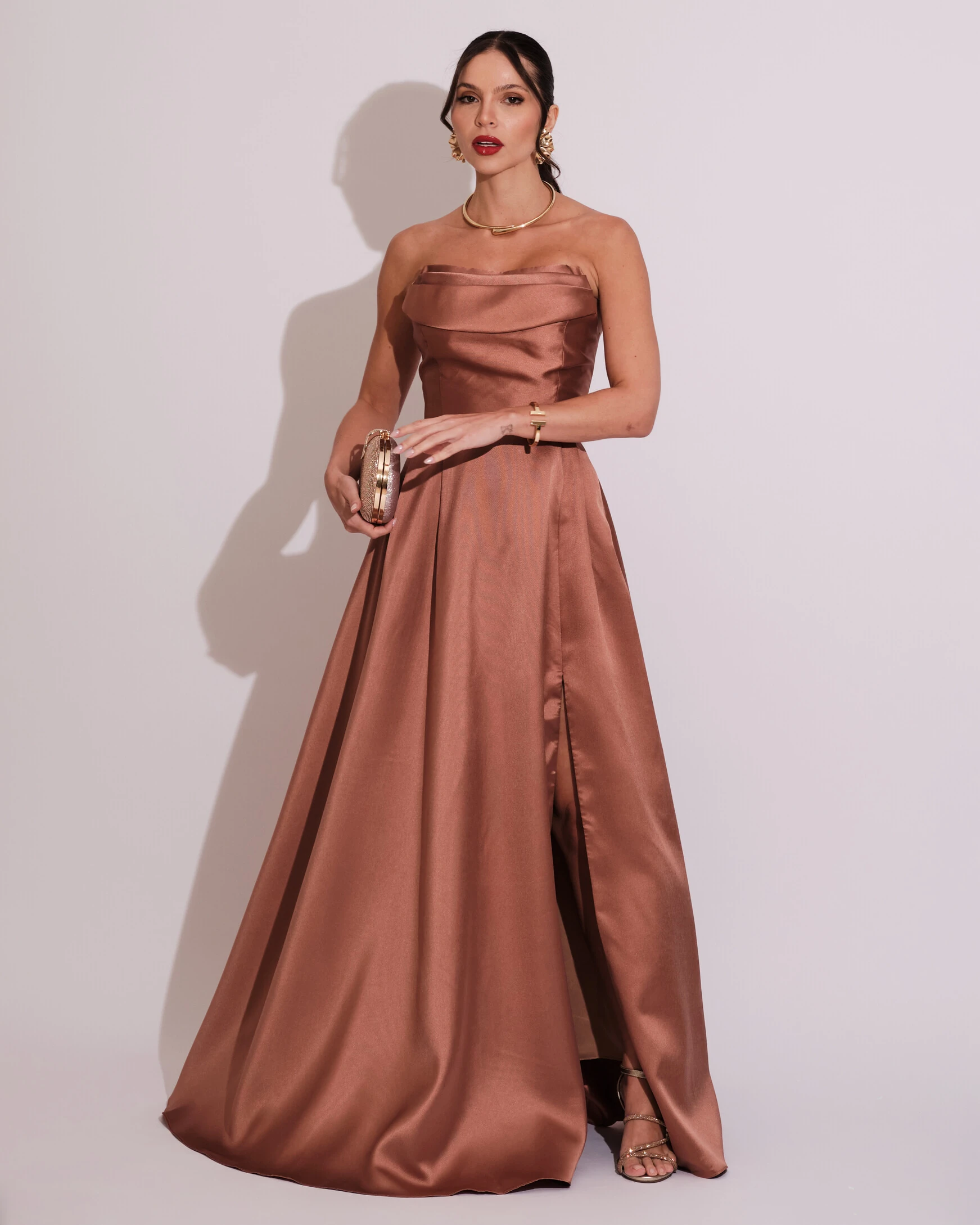 O vestido une estrutura e feminilidade em cada detalhe. Seu caimento acinturado com saia levemente evasê valoriza a silhueta, enquanto o tomara que caia traz um ar moderno e elegante. O destaque fica por conta das costas trançadas com amarração ajustável, que garantem um charme extra e perfeito caimento ao corpo. Além disso, a fenda lateral adiciona um toque sensual e ousado ao visual. Ideal para formaturas, casamentos noturnos ou eventos sofisticados, pode ser combinado com sandálias de salto alto, clutch em tons metálicos e brincos longos que valorizem o colo.