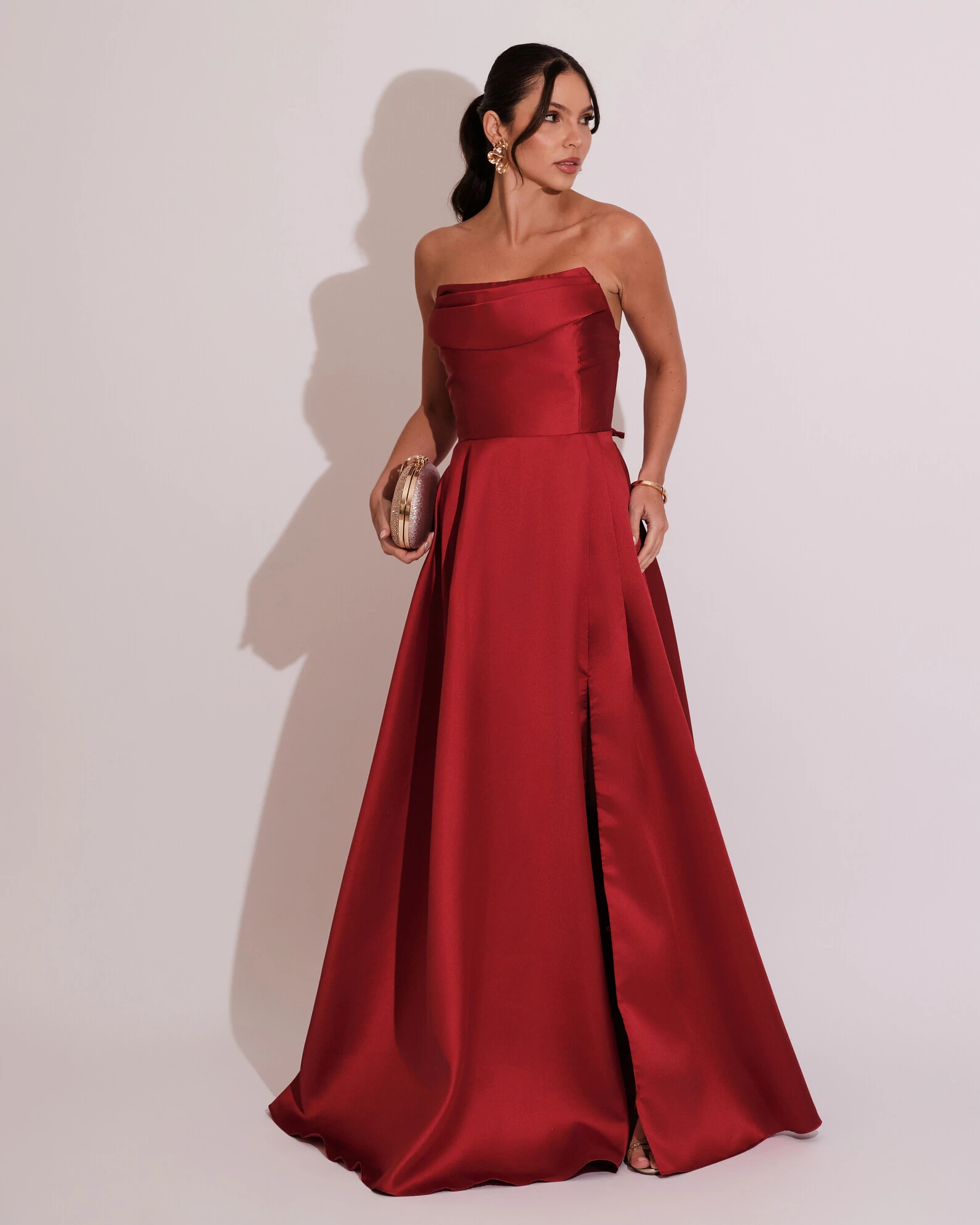 VESTIDO DE FESTA LONGO TOMARA QUE CAIA TRANÇADO COSTA EM ZIBELINE - O vestido de festa longo tomara que caia com trançado nas costas, confeccionado em zibeline, é a escolha perfeita para quem busca sofisticação com um toque de sensualidade discreta. Seu caimento estruturado valoriza a silhueta, enquanto o detalhe trançado nas costas acrescenta charme e originalidade ao look. Ideal para casamentos noturnos, formaturas ou eventos de gala, ele pode ser combinado com brincos statement, clutch metálica e sandálias de salto fino. Para completar o visual, um penteado preso valoriza o decote e destaca o trançado, tornando o look ainda mais impactante em ambientes como salões luxuosos, espaços ao ar livre elegantes ou festas em hotéis refinados.