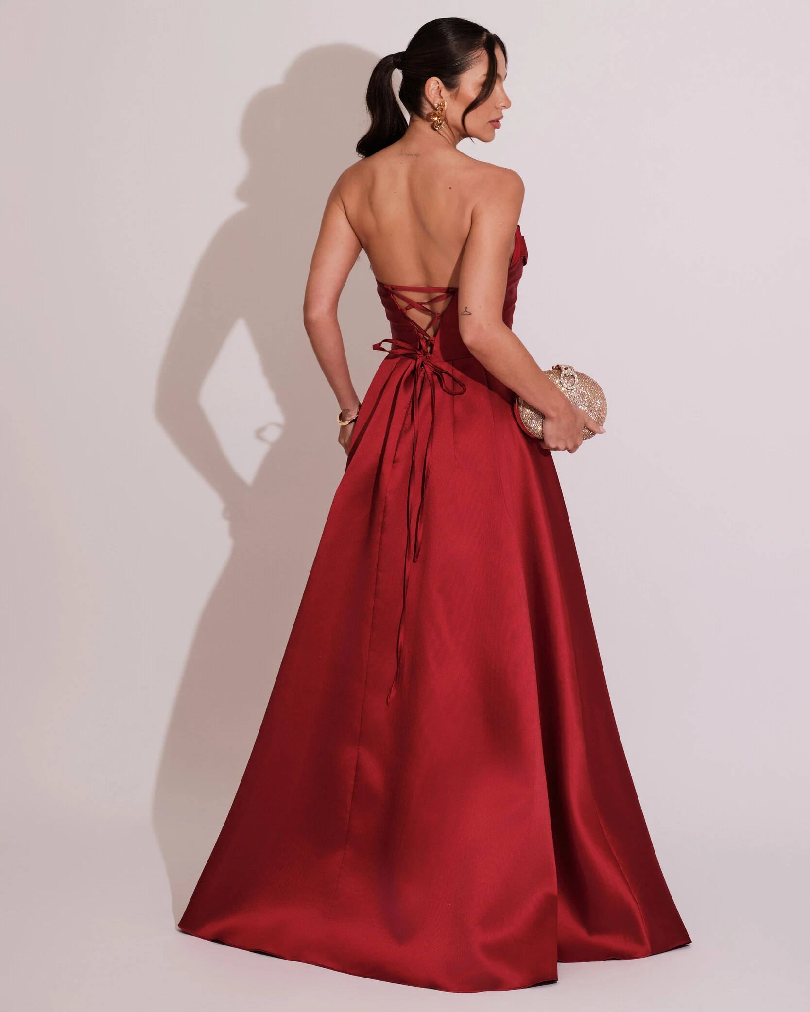 Vestido de Festa Longo Tomara que Caia Trançado Costa em Zibeline Marsala