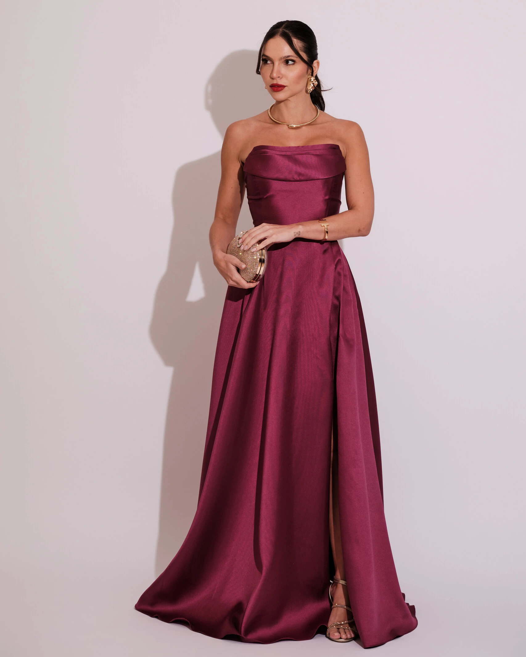 VESTIDO DE FESTA LONGO TOMARA QUE CAIA TRANÇADO COSTA EM ZIBELINE - O vestido de festa longo tomara que caia com trançado nas costas, confeccionado em zibeline, é a escolha perfeita para quem busca sofisticação com um toque de sensualidade discreta. Seu caimento estruturado valoriza a silhueta, enquanto o detalhe trançado nas costas acrescenta charme e originalidade ao look. Ideal para casamentos noturnos, formaturas ou eventos de gala, ele pode ser combinado com brincos statement, clutch metálica e sandálias de salto fino. Para completar o visual, um penteado preso valoriza o decote e destaca o trançado, tornando o look ainda mais impactante em ambientes como salões luxuosos, espaços ao ar livre elegantes ou festas em hotéis refinados.