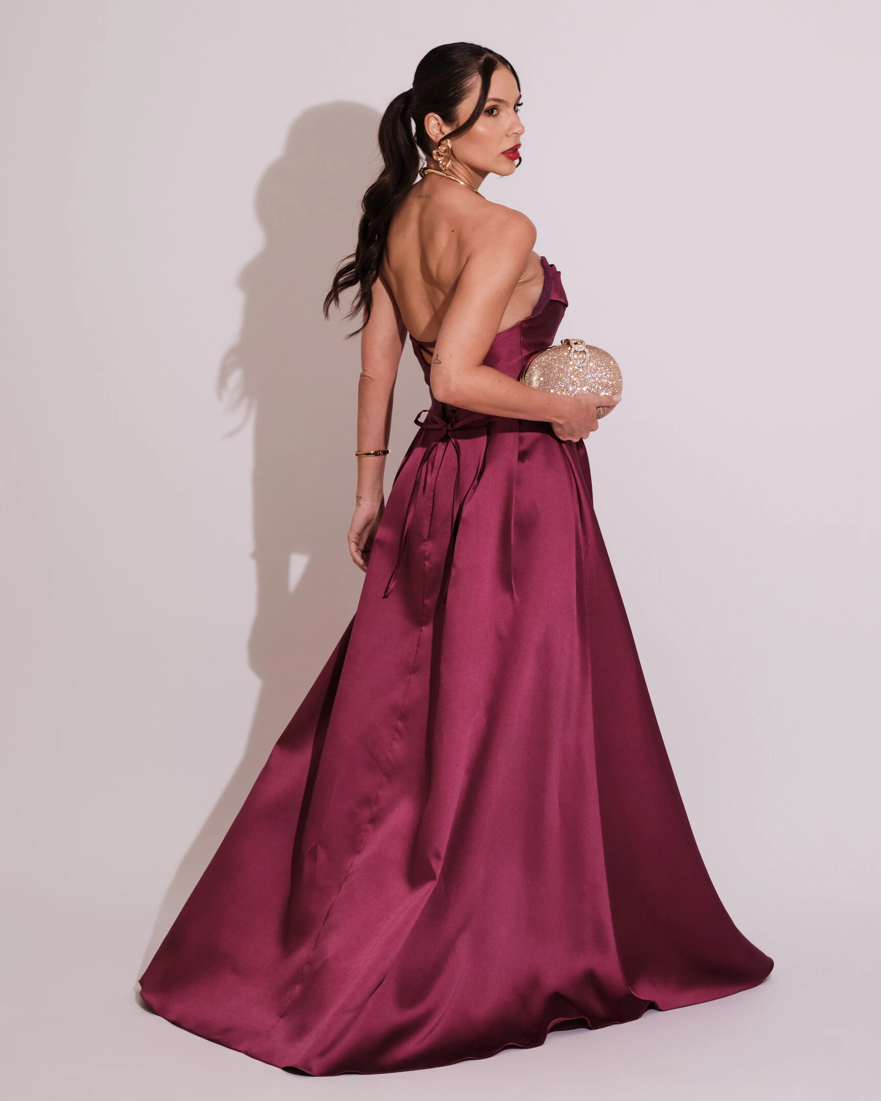 O vestido une estrutura e feminilidade em cada detalhe. Seu caimento acinturado com saia levemente evasê valoriza a silhueta, enquanto o tomara que caia traz um ar moderno e elegante. O destaque fica por conta das costas trançadas com amarração ajustável, que garantem um charme extra e perfeito caimento ao corpo. Além disso, a fenda lateral adiciona um toque sensual e ousado ao visual. Ideal para formaturas, casamentos noturnos ou eventos sofisticados, pode ser combinado com sandálias de salto alto, clutch em tons metálicos e brincos longos que valorizem o colo.