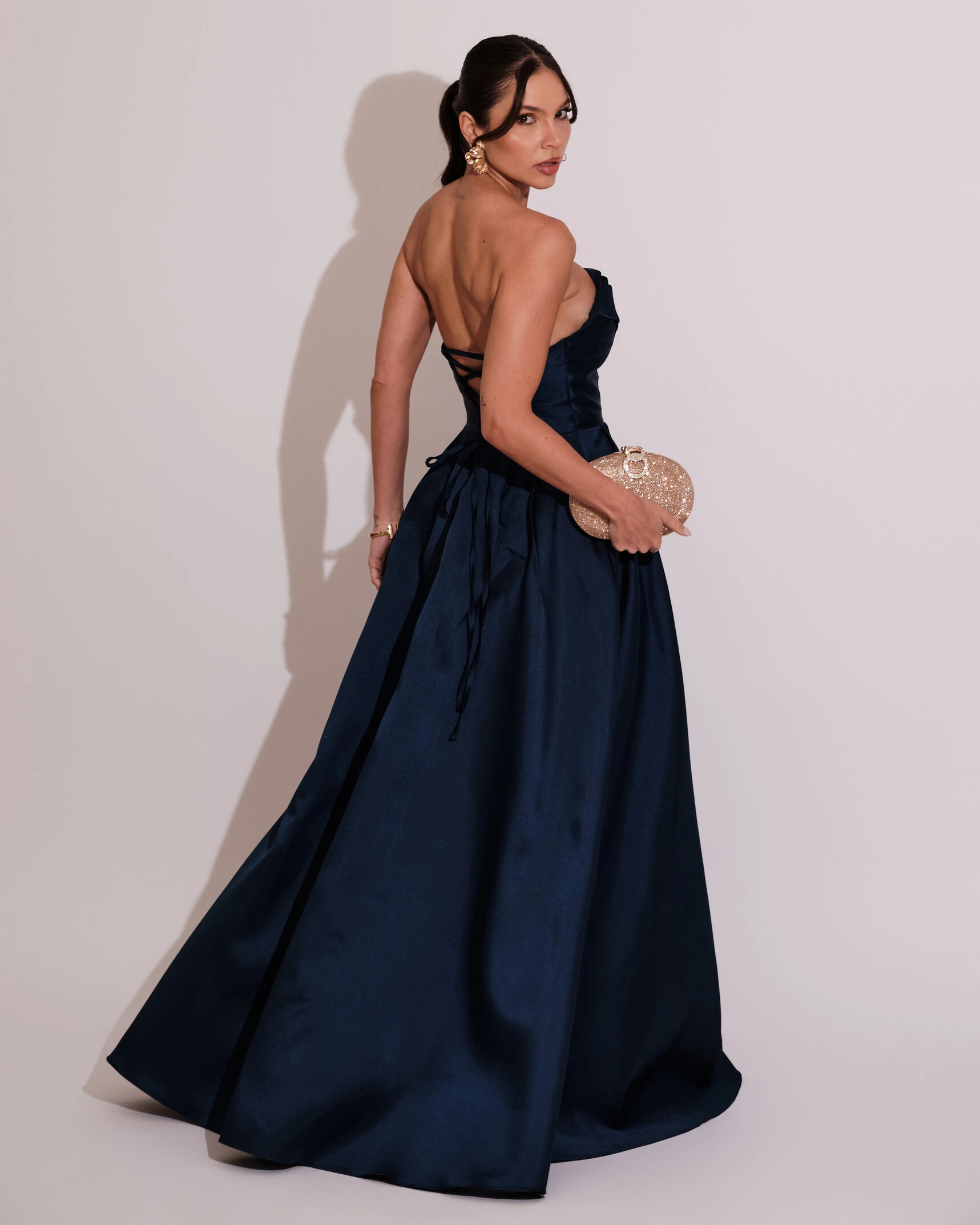 Vestido de Festa Longo Tomara que Caia Trançado Costa em Zibeline Azul Marinho