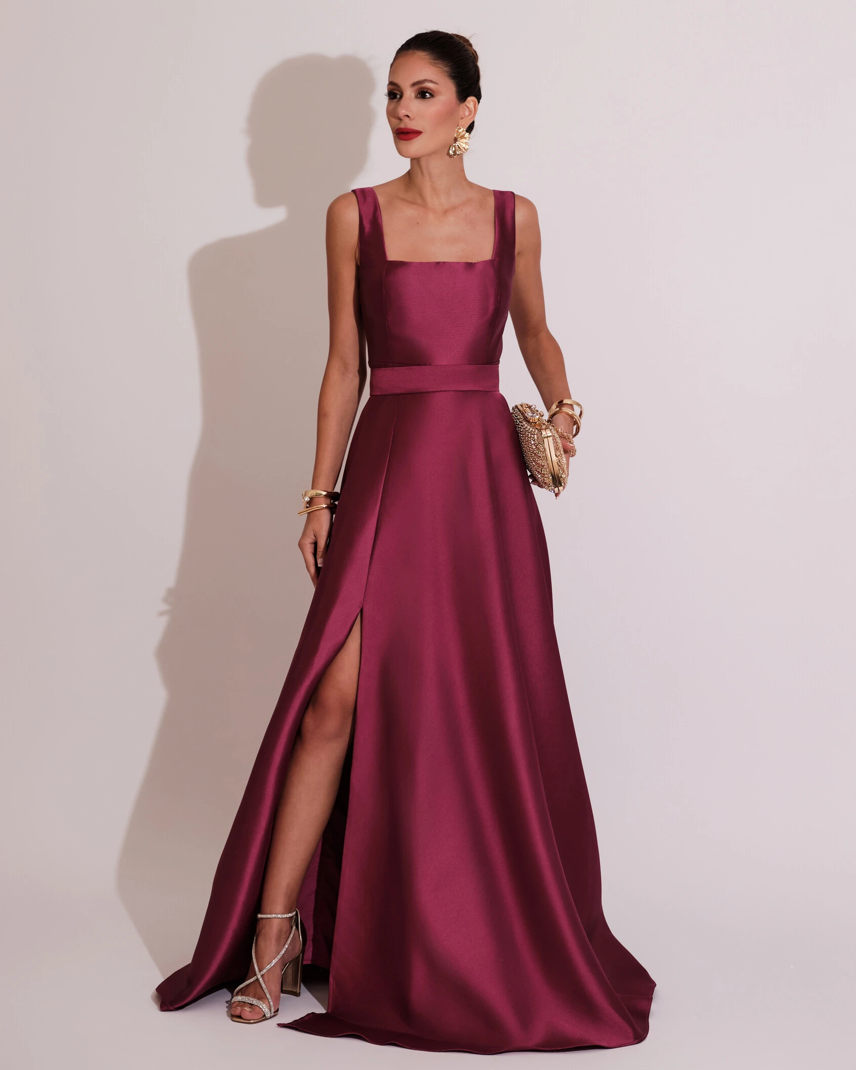 VESTIDO DE FESTA LONGO ZIBELINE COM FENDA E FAIXA - Esse vestido longo em zibeline combina a sofisticação da modelagem com a imponência do tecido estruturado, garantindo presença marcante em qualquer ocasião especial. Ideal para casamentos noturnos, bailes de gala, premiações, formaturas ou eventos de etiqueta em salões e espaços luxuosos, ele transmite elegância clássica com um toque contemporâneo. Para complementar, aposte em acessórios sofisticados, como joias douradas ou prateadas, clutch rígida e sandálias de salto fino. Se desejar um ar ainda mais refinado, invista em brincos statement ou em um penteado preso que valorize o decote quadrado e os ombros.