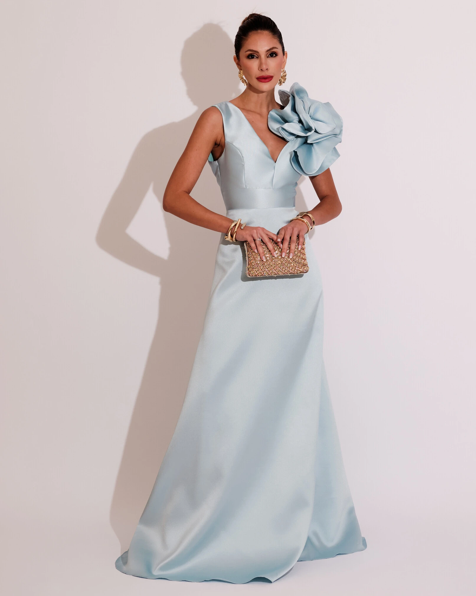 VESTIDO DE FESTA LONGO ZIBELINE FLOR - Este deslumbrante vestido de festa longo em zibeline é a escolha perfeita para ocasiões especiais, como casamentos, formaturas e festas de gala. Para completar o look, sugerimos acessórios delicados, como brincos de pérola e uma clutch prateada. Um par de sandálias de tiras finas em tom neutro vai adicionar sofisticação sem competir com a beleza do vestido.
