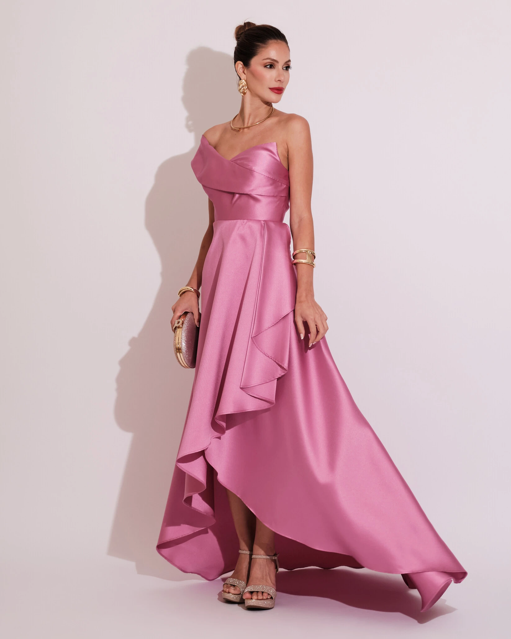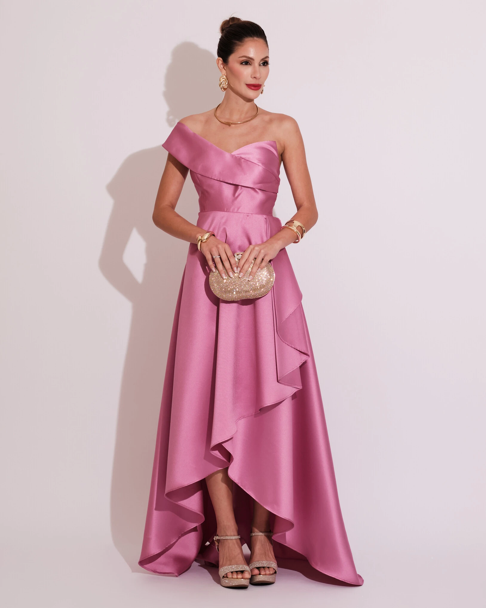 VESTIDO DE FESTA LONGO ZIBELINE UM OMBRO SÓ MULLET - Elegante e sofisticado, este vestido em zibeline um ombro só e saia assimétrica com camadas que garantem movimento e modernidade. Ideal para casamentos noturnos, formaturas ou eventos de gala, ele combina perfeitamente com sandálias de tiras finas, clutch metalizada e joias delicadas em dourado ou esmeralda, criando um visual refinado e cheio de presença.