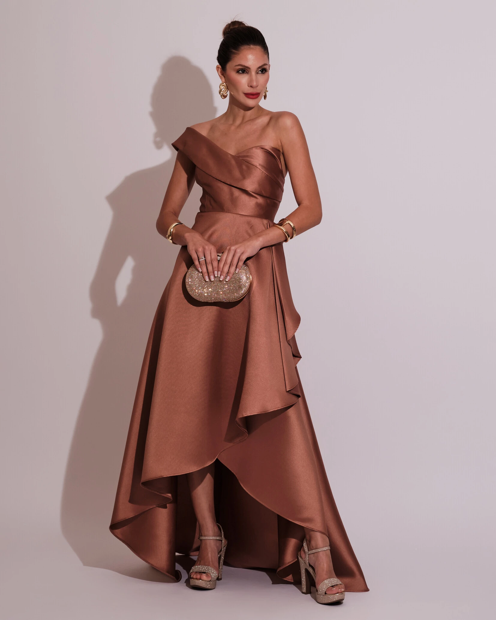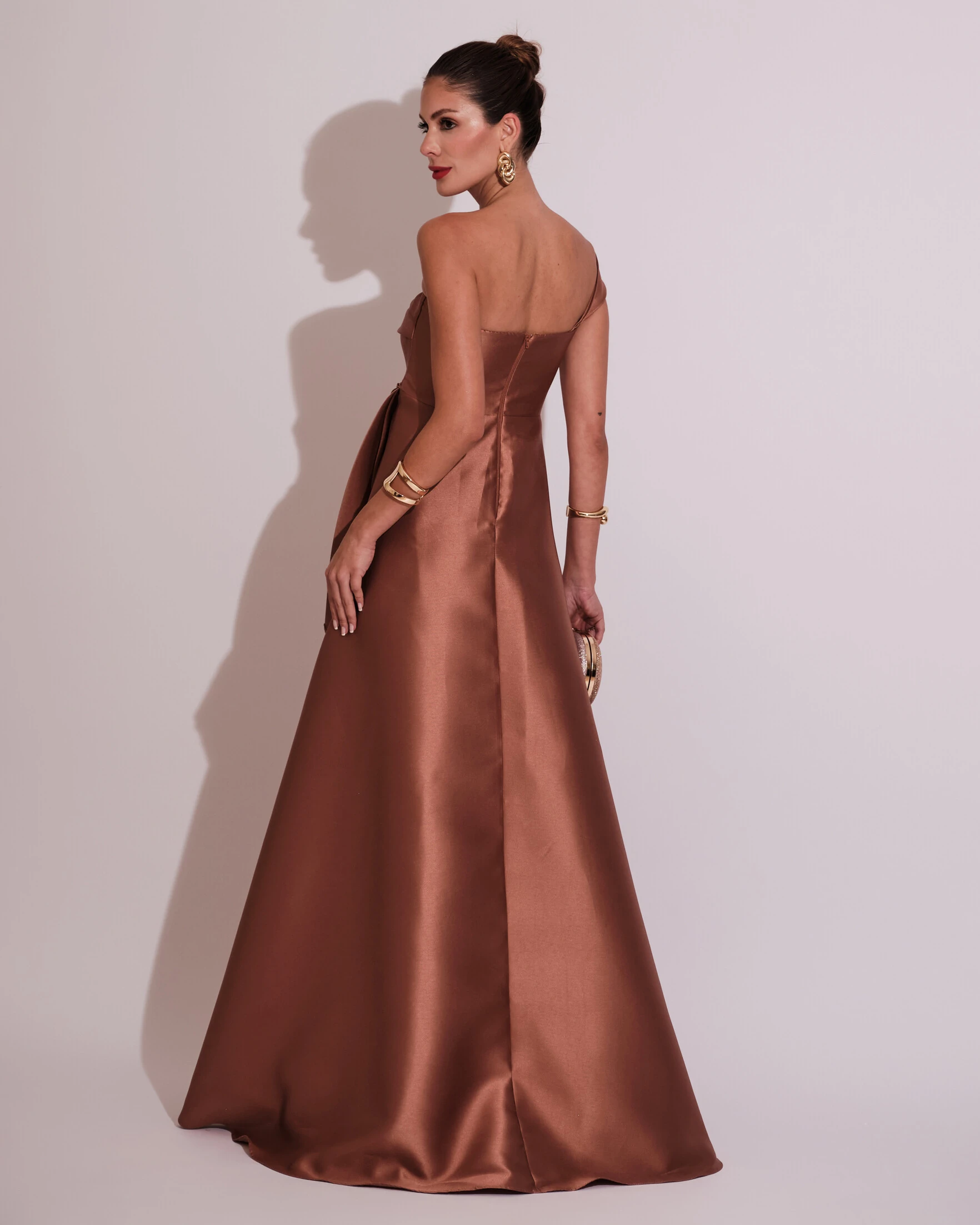 Vestido de Festa Longo Zibeline um Ombro Só Mullet Mocha Mousse