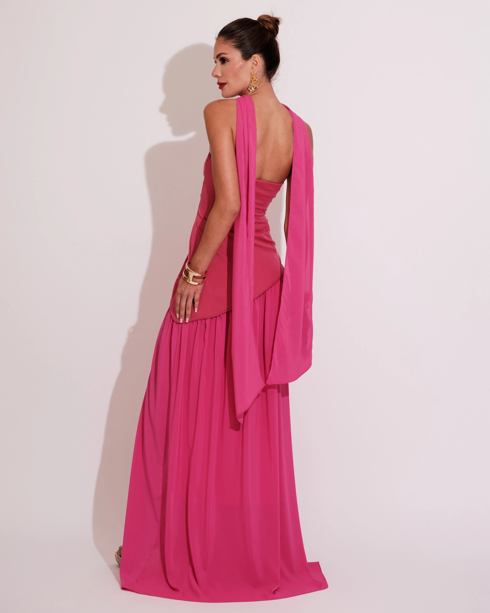 Vestido de Festa Longo Tomara que Caia Alfaiataria e Saia Crepe Chiffon e Lenço Pink