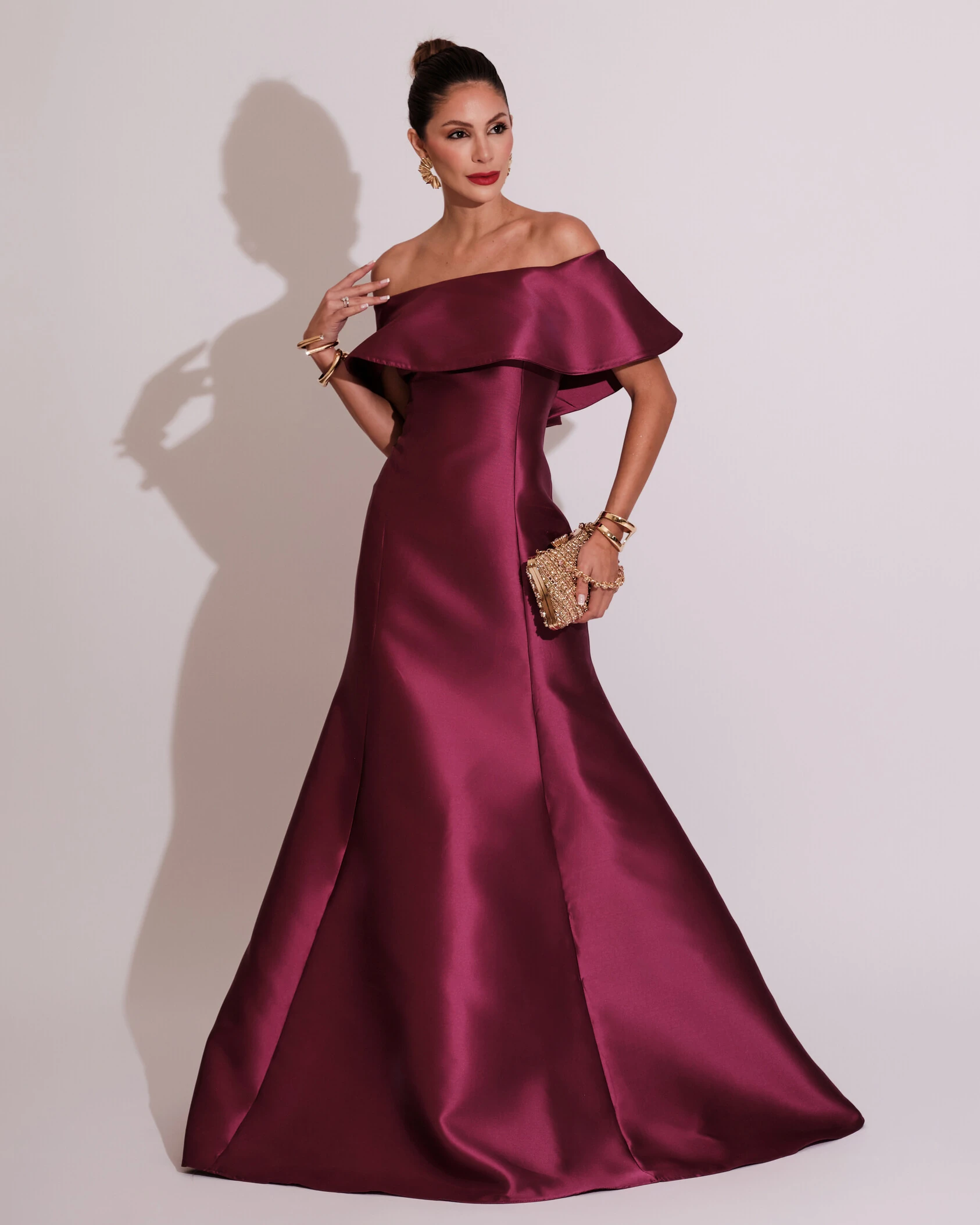 VESTIDO DE FESTA LONGO OMBRO A OMBRO ZIBELINE COM BABADOS - Este vestido longo com caimento elegante e decote ombro a ombro com babado, exala sofisticação e feminilidade. Ideal para eventos formais, como casamentos, jantares de gala ou formaturas, ele pode ser complementado por acessórios dourados ou neutros, como brincos statement, pulseiras delicadas e uma clutch elegante. Nos pés, sandálias de salto fino ou scarpins alongam a silhueta, enquanto um penteado preso ou semi-preso destaca o decote e o rosto, criando um look equilibrado, moderno e refinado.