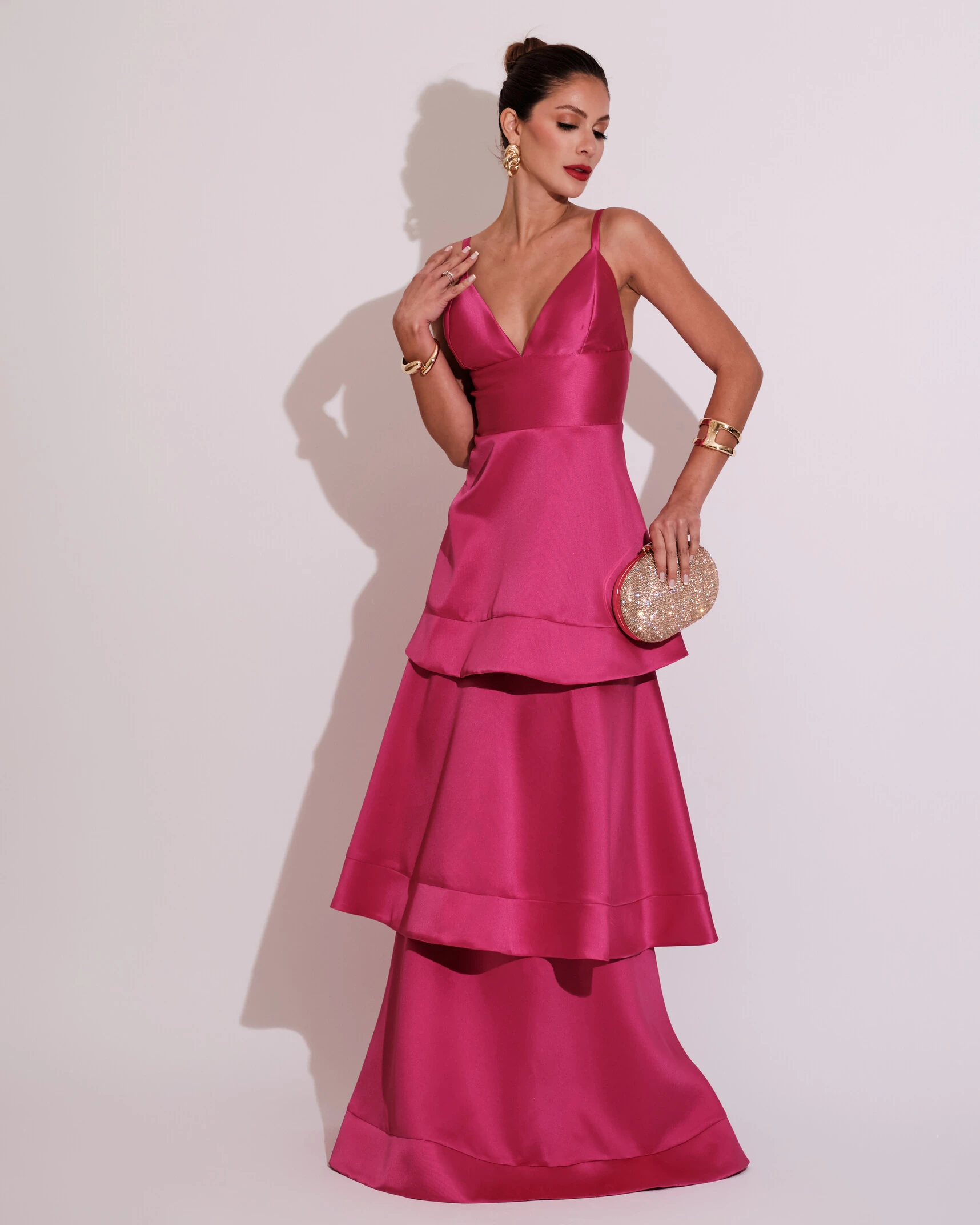 VESTIDO DE FESTA LONGO ZIBELINE EM CAMADAS COM DECOTE EM V E ALÇAS - Este vestido longo com decote em V, alças finas e saia em camadas estruturadas, é uma escolha ousada e sofisticada para eventos noturnos como formaturas, casamentos, bailes de gala ou festas de 15 anos. O tom vibrante e o brilho sutil do tecido pedem acessórios mais discretos, como brincos alongados em prata ou dourado, clutch minimalista e sandálias de salto fino. Um penteado preso, como coque baixo ou rabo de cavalo polido, valoriza o decote e traz elegância ao visual, perfeito para locais como salões de festas, casas de eventos ou ambientes ao ar livre com proposta sofisticada.