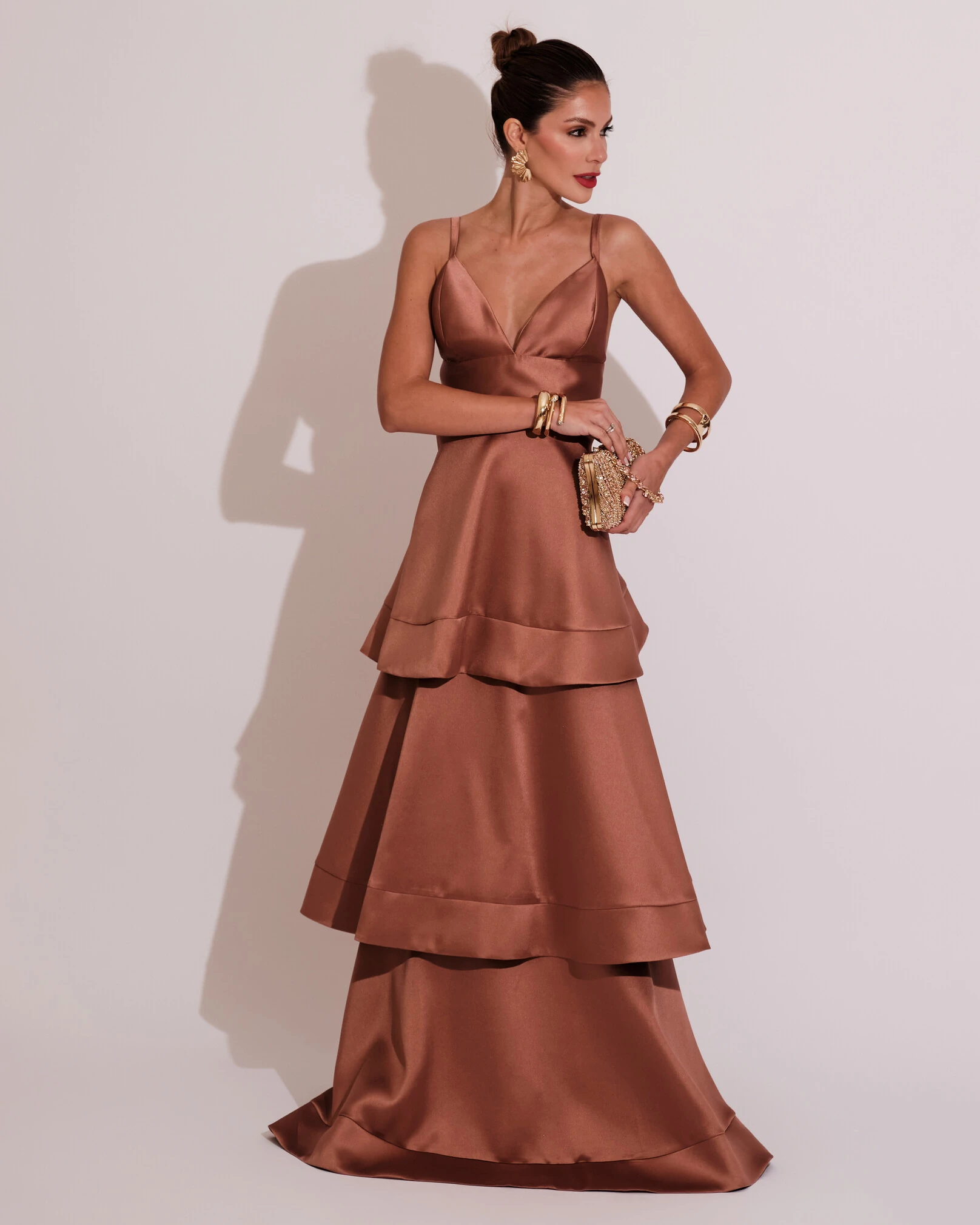 Vestido de Festa Longo Zibeline em Camadas Decote em V com Alças Mocha Mousse