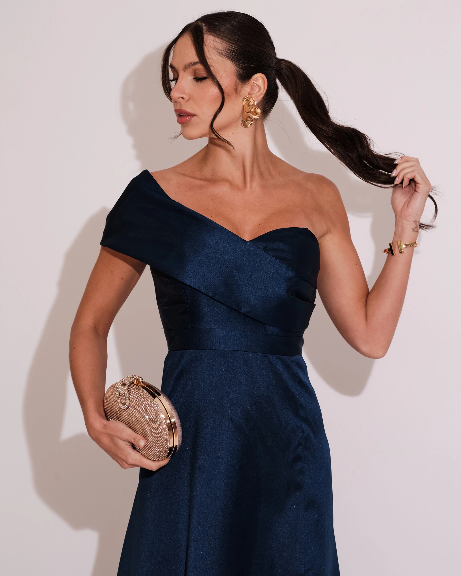 Vestido de Festa longo Faixa Ombro e Fenda Zibeline Azul Marinho