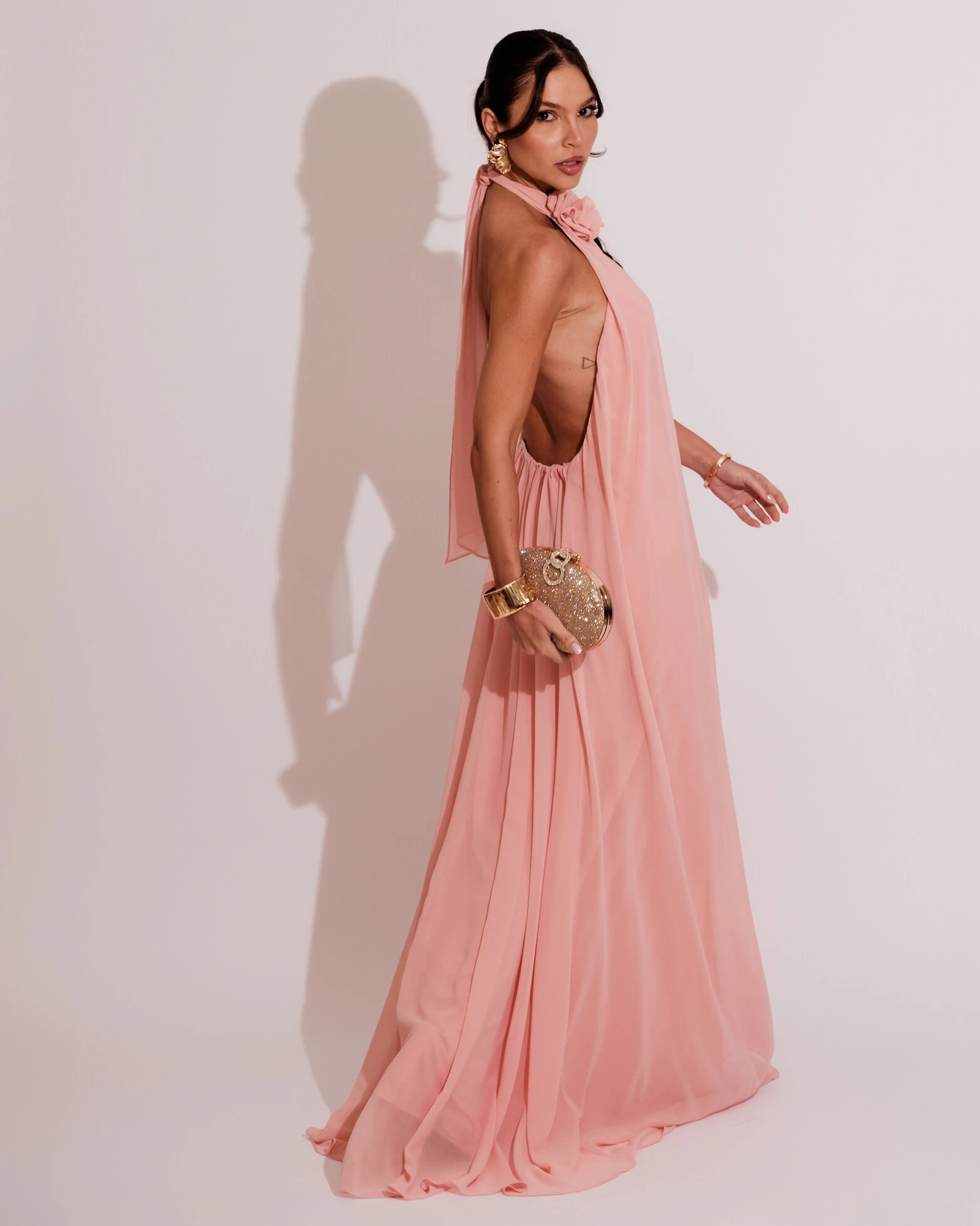 Confeccionado em tecido leve com caimento reto e elegante. Possui modelagem halter com gola alta adornada por uma delicada flor aplicada, que traz um toque romântico e sofisticado ao design minimalista. A parte frontal tem leves franzidos na base da gola, proporcionando fluidez ao caimento. Nas costas, o vestido é totalmente aberto, deixando-as à mostra e criando um contraste marcante com a frente mais fechada. A saia longa desce solta até o chão, garantindo movimento leve e uma silhueta alongada.
