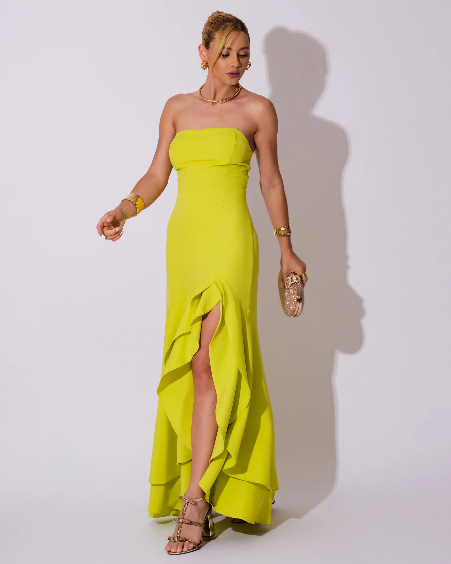 O vestido é confeccionado com um bojo estruturado que oferece suporte e modela o busto de forma delicada, proporcionando confiança e conforto ao vestir. A alfaiataria, com seu toque firme e fluido, garante um caimento impecável, enquanto a fenda em babados confere charme e dinamismo aos passos. O zíper nas costas facilita o ajuste perfeito, tornando a peça ainda mais prática. Ideal para quem busca um visual sofisticado com um toque moderno e atrevido.