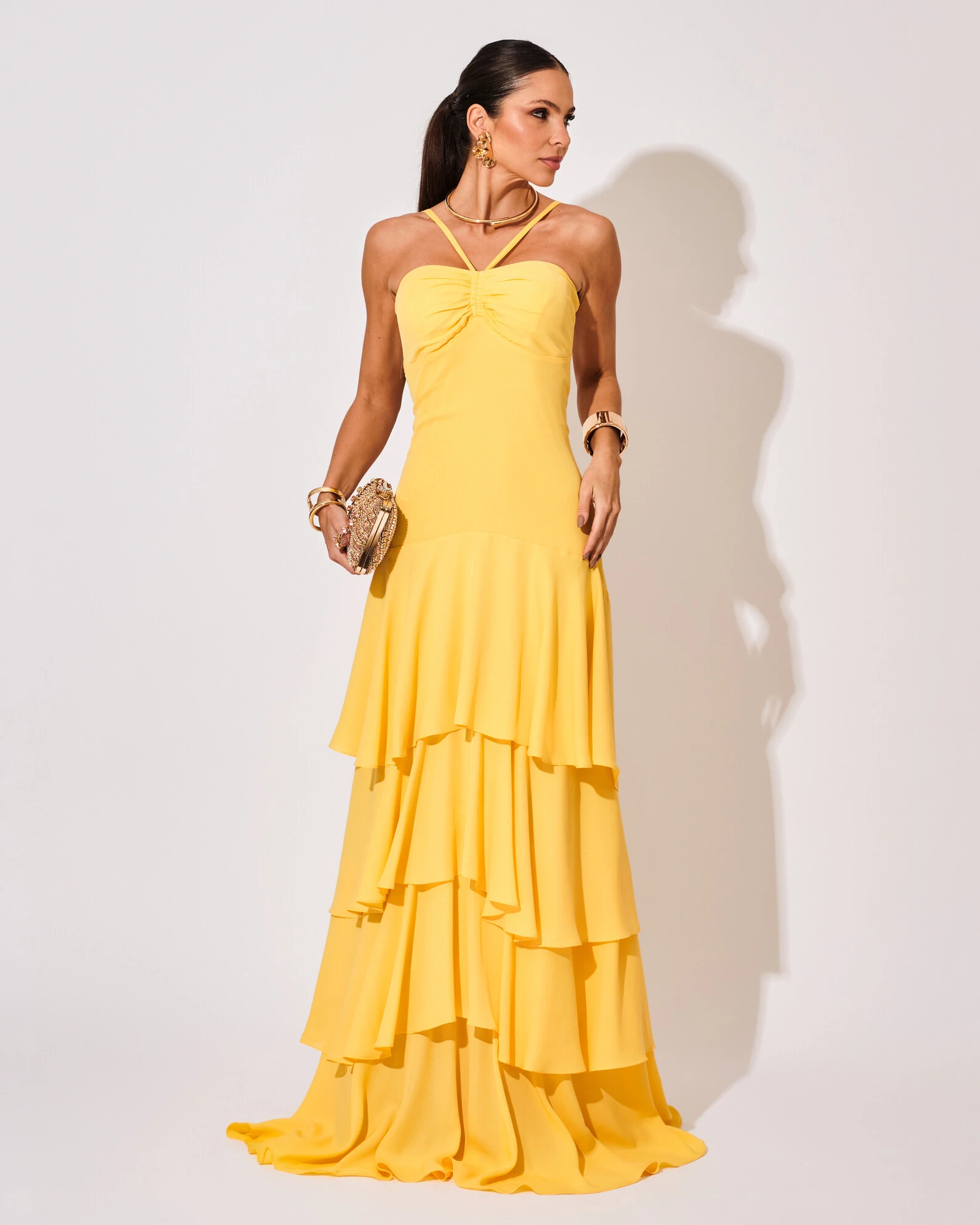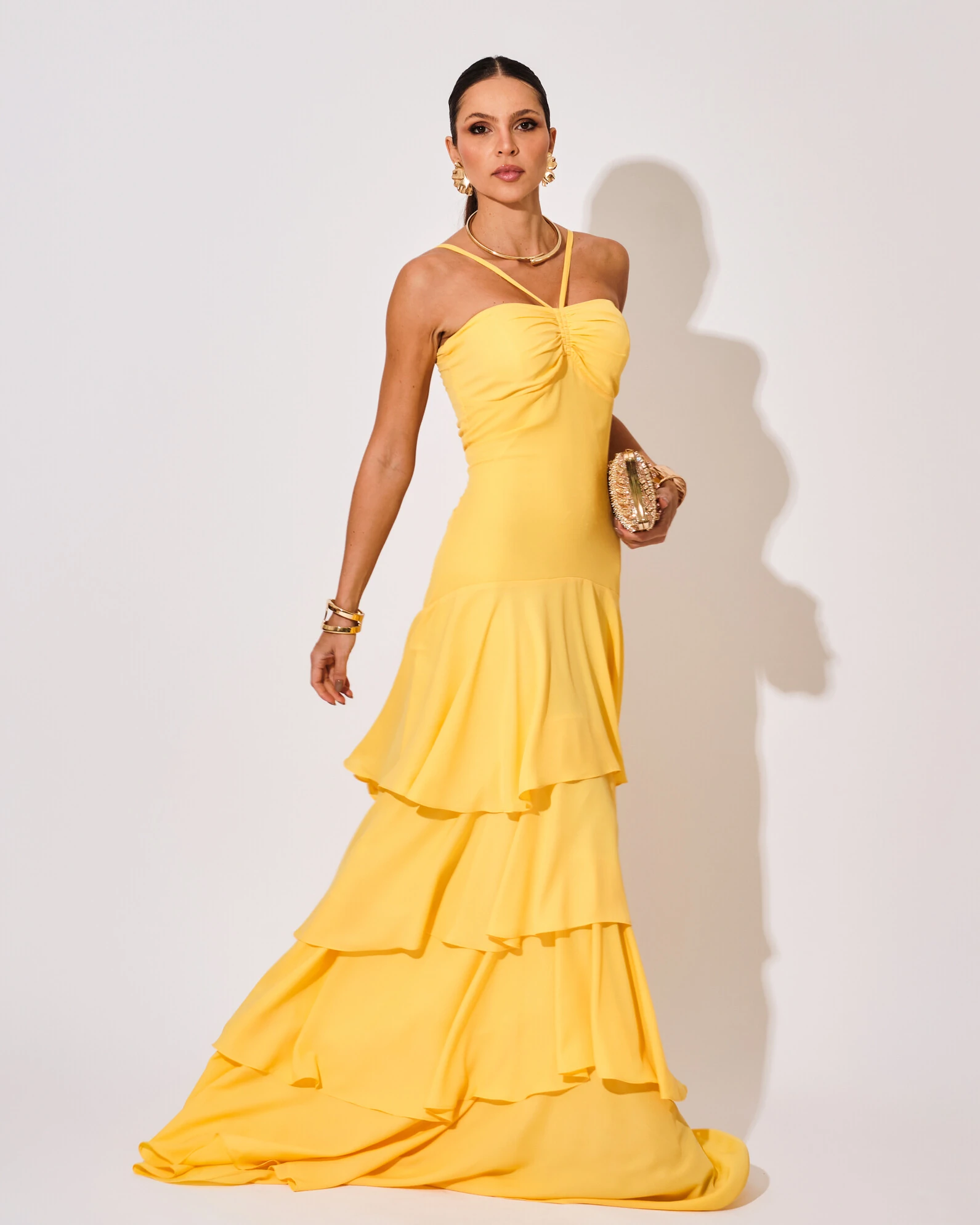 Vestido Longo Crepe com Babado em Camadas Amarelo