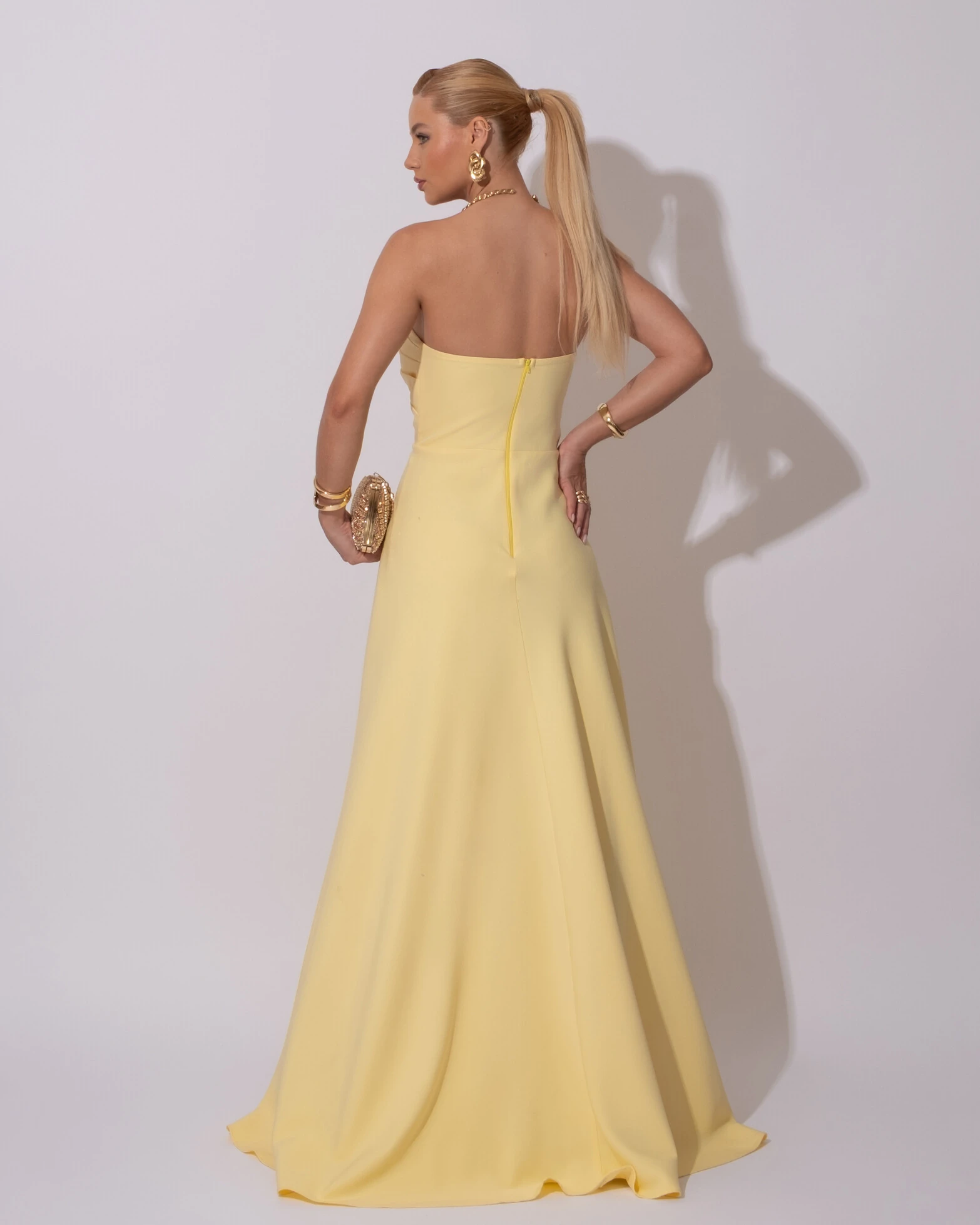 O vestido é longo e confeccionado em tecido de caimento elegante, com modelagem tomara que caia. O busto apresenta drapeados estruturados que se sobrepõem e formam um delicado detalhe floral, acrescentando sofisticação e destaque à parte superior. A saia é ampla, com corte fluido, e conta com uma fenda lateral que adiciona sensualidade e leveza ao movimento.
