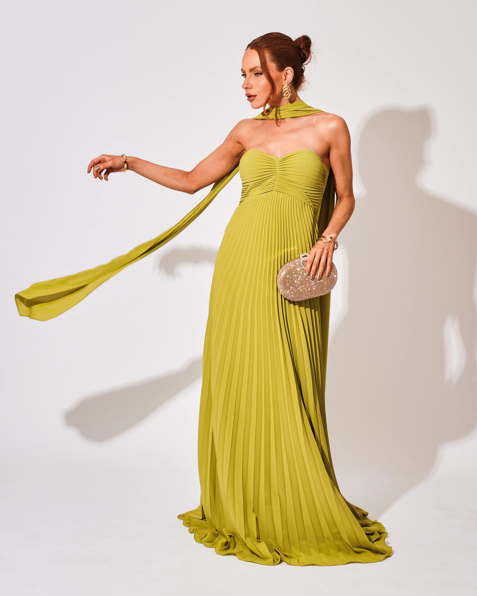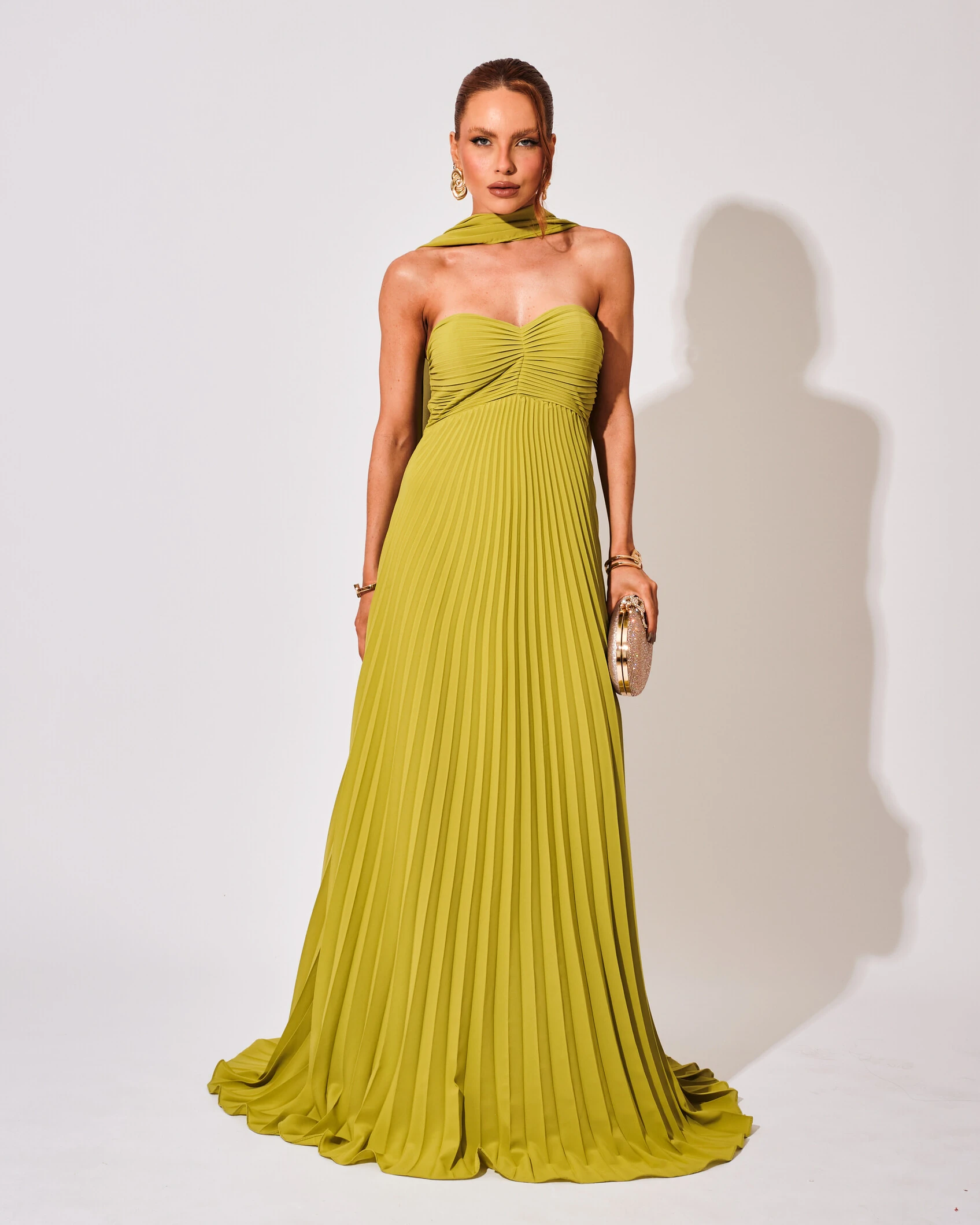 Vestido de Festa Longo Tomara que Caia Plissado com Lenço Verde Pistache