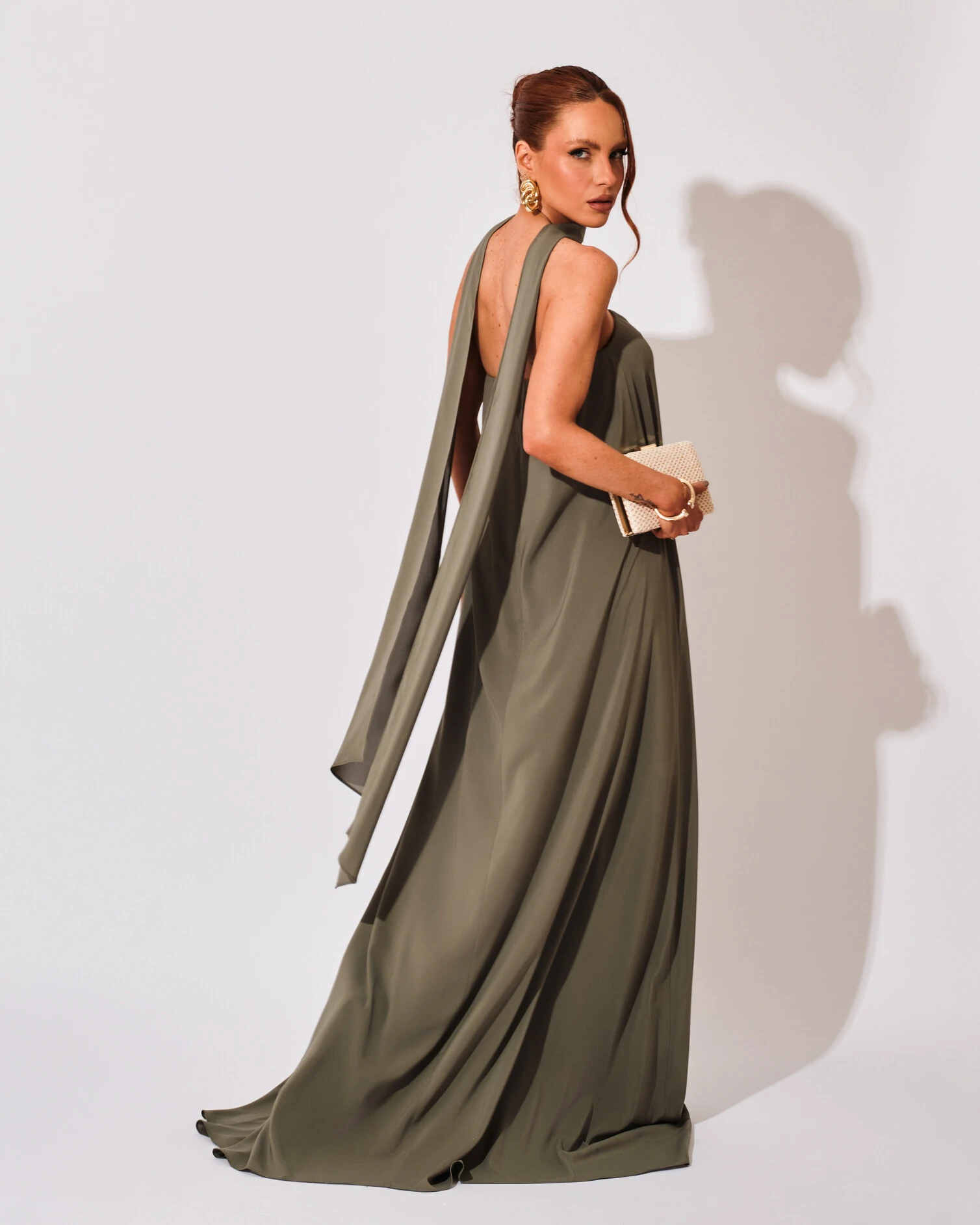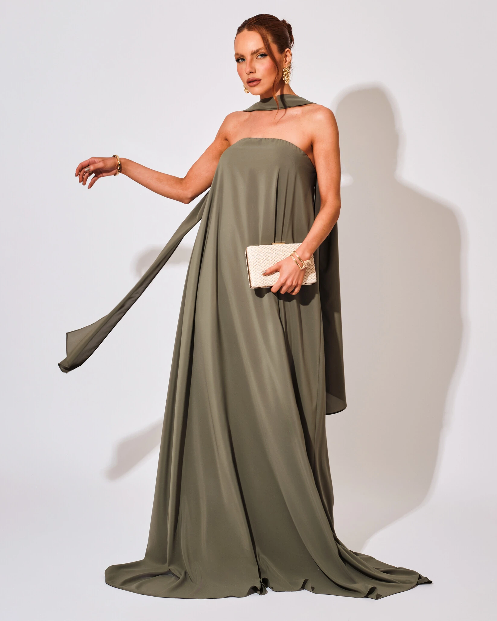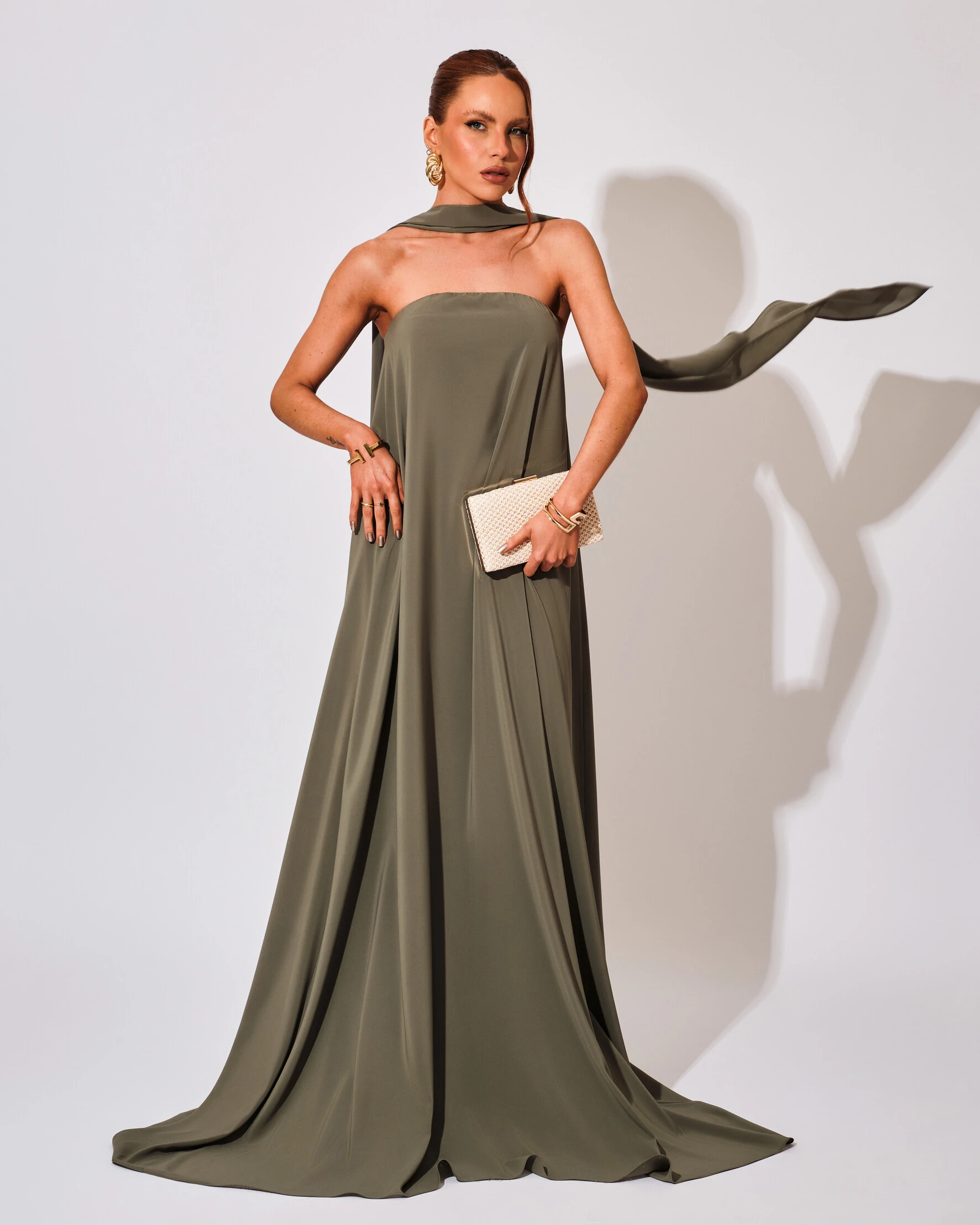 Vestido de Festa Longo Crepe Tomara que Caia com Lenço Verde Oliva