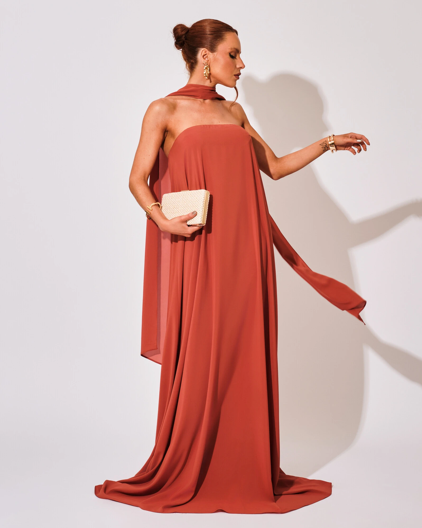 VESTIDO DE FESTA LONGO CREPE TOMARA QUE CAIA COM LENÇO - Esse vestido de festa longo é a definição de elegância minimalista — o caimento fluido e o modelo tomara que caia com echarpe trazem um ar sofisticado e moderno. Ideal para casamentos noturnos, formaturas e eventos de gala, ele combina perfeitamente com acessórios dourados ou em pedrarias, brincos grandes e braceletes estruturados. Um coque alto ou penteado polido valoriza ainda mais o colo e o detalhe da echarpe, enquanto uma clutch metálica e sandálias finas completam o visual com requinte.