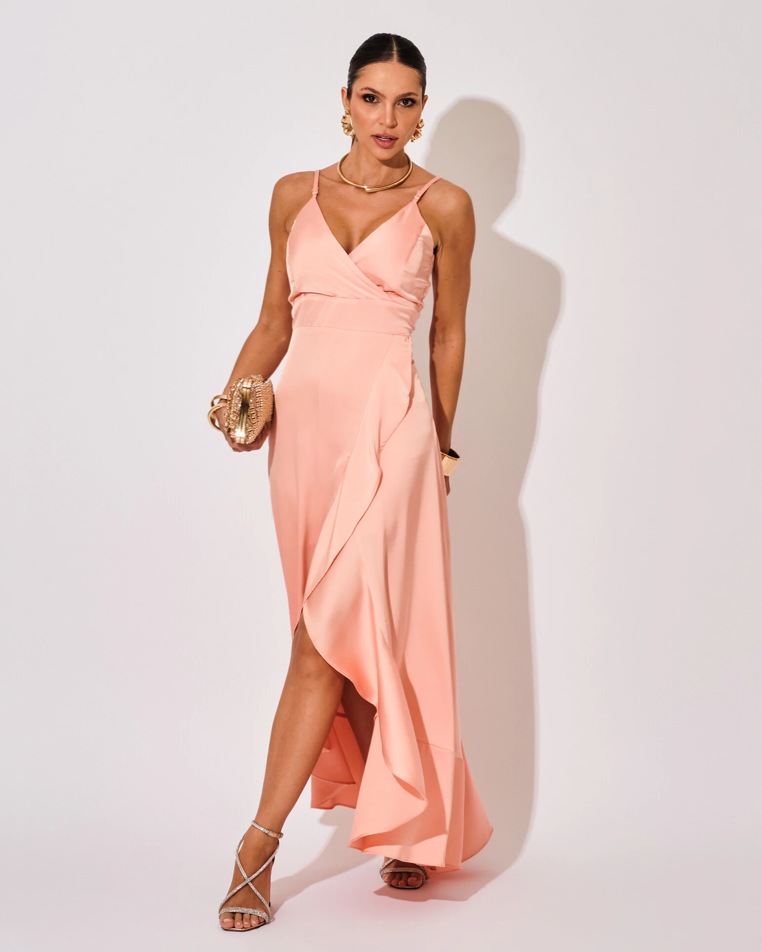 Um vestido de alças finas com um babado na sua fenda que é a partir da cintura e cruza o corpo ao fim, trazendo um acabamento sobreposto na sua barra!