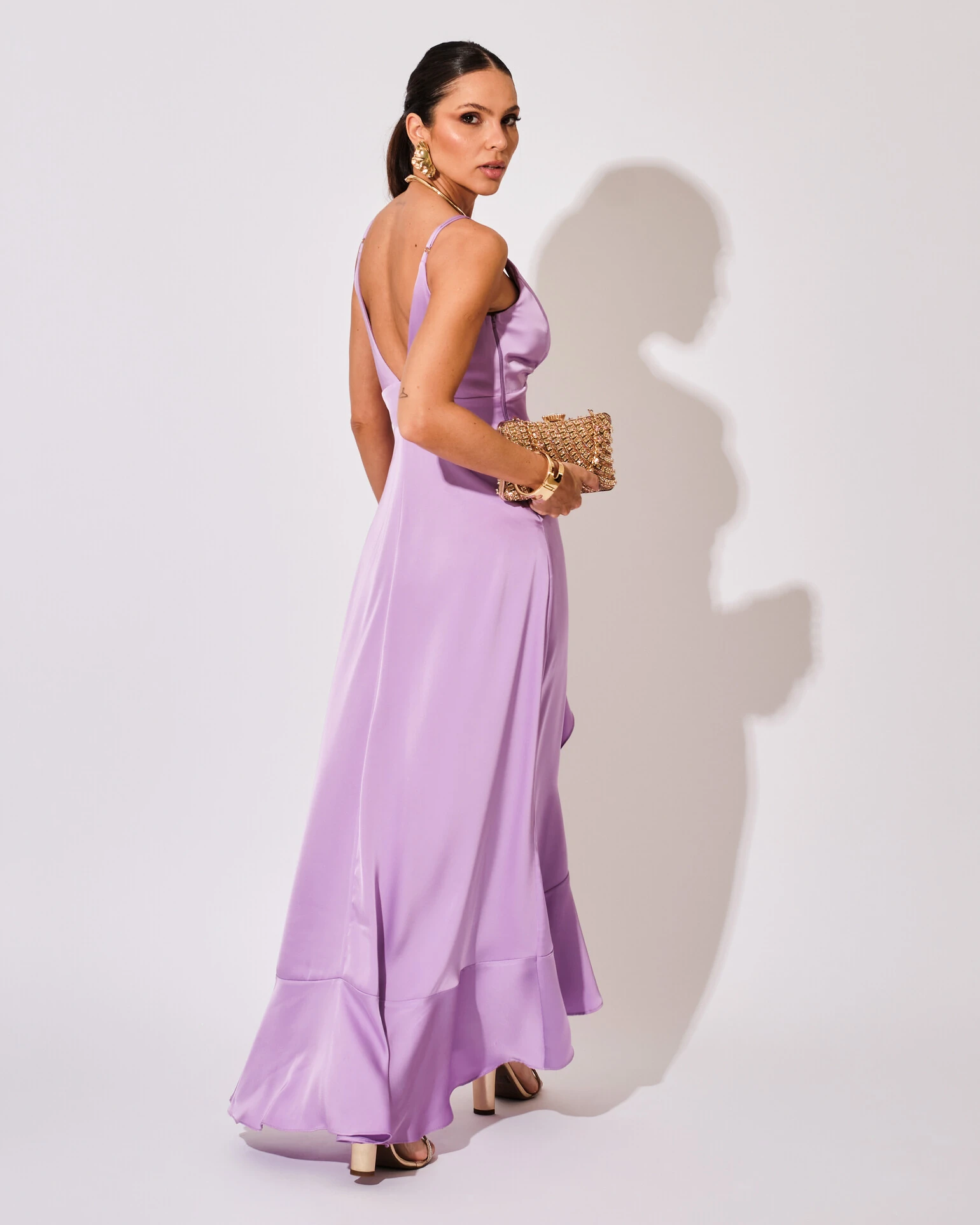 Um vestido de alças finas com um babado na sua fenda que é a partir da cintura e cruza o corpo ao fim, trazendo um acabamento sobreposto na sua barra!