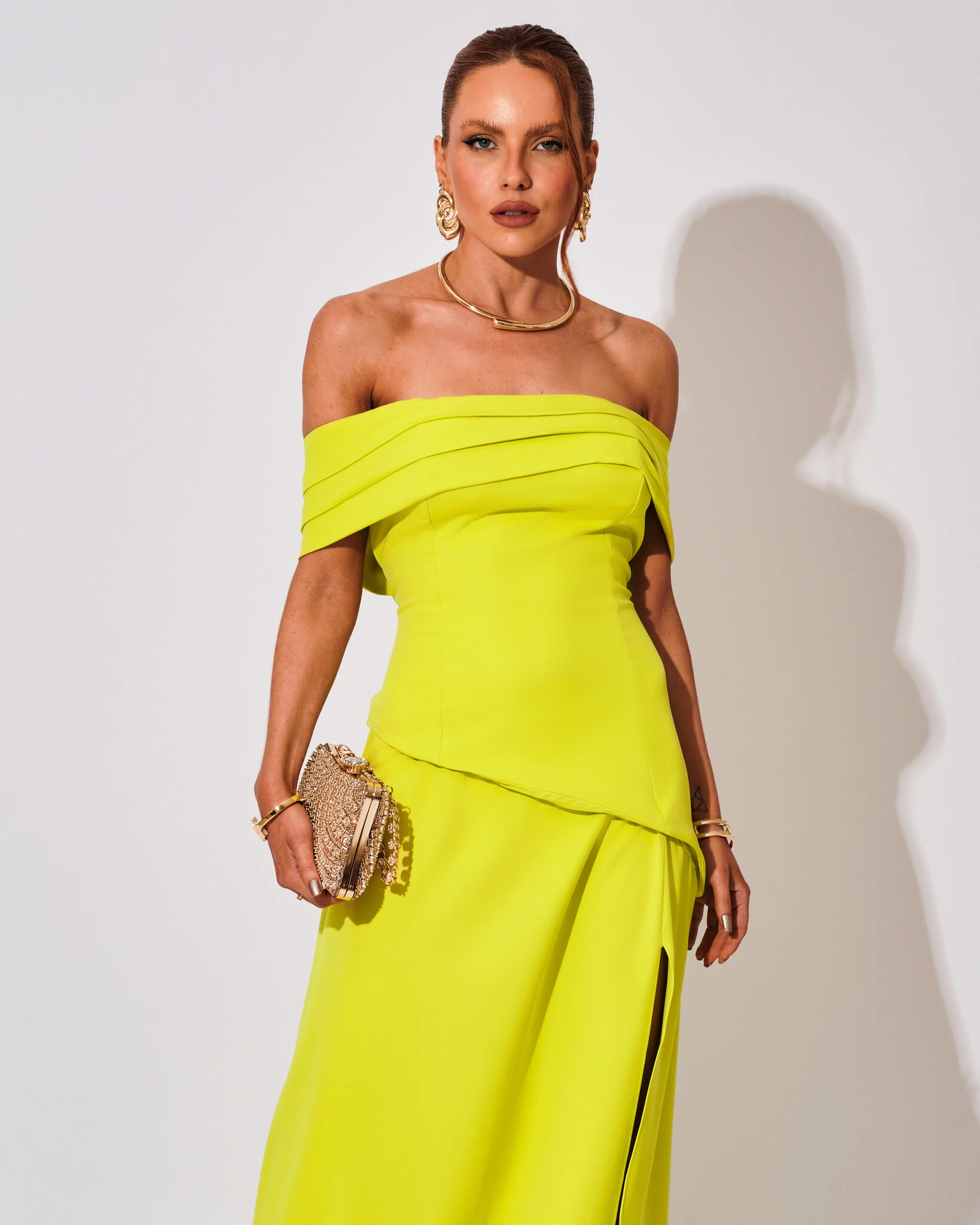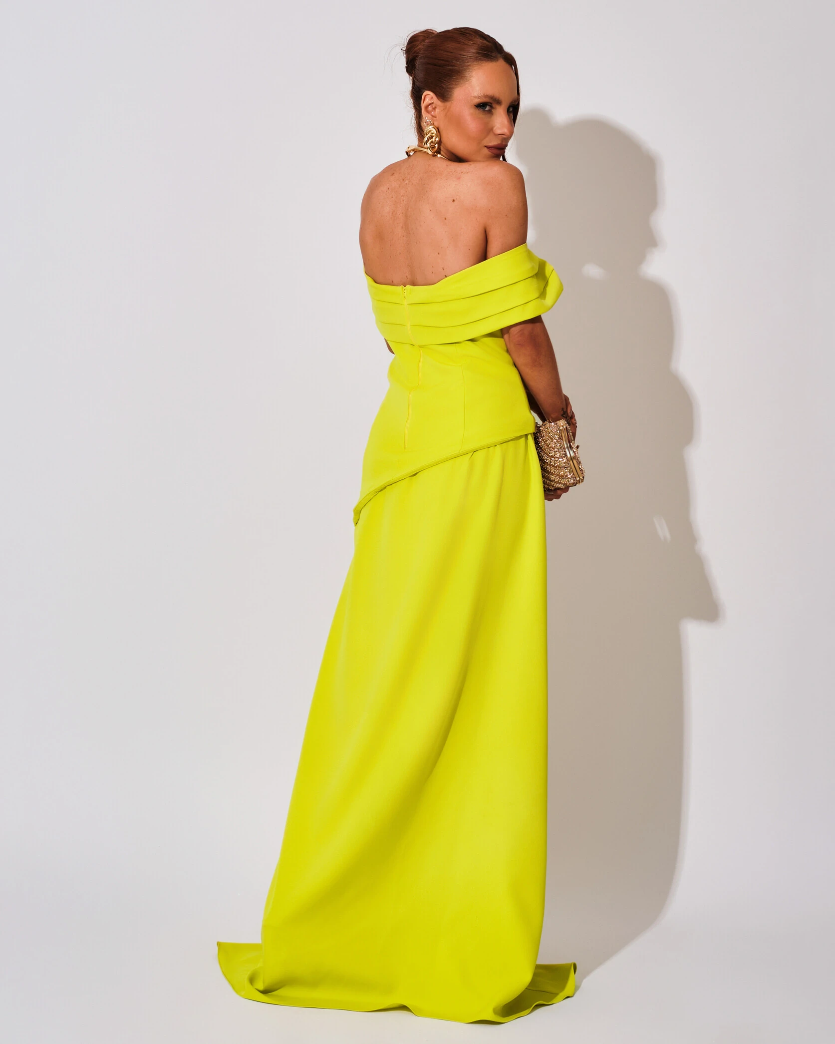 Vestido de Festa Longo Alfaiataria Ombro a Ombro Drapeado com Fenda Verde Lima