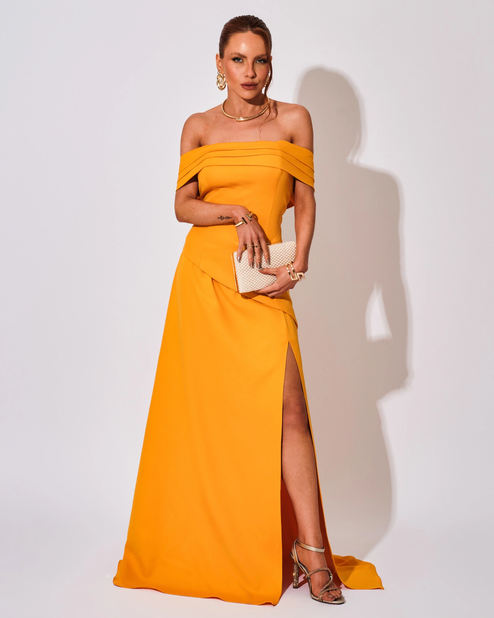 Vestido de Festa Longo Alfaiataria Ombro a Ombro Drapeado com Fenda Laranja manga