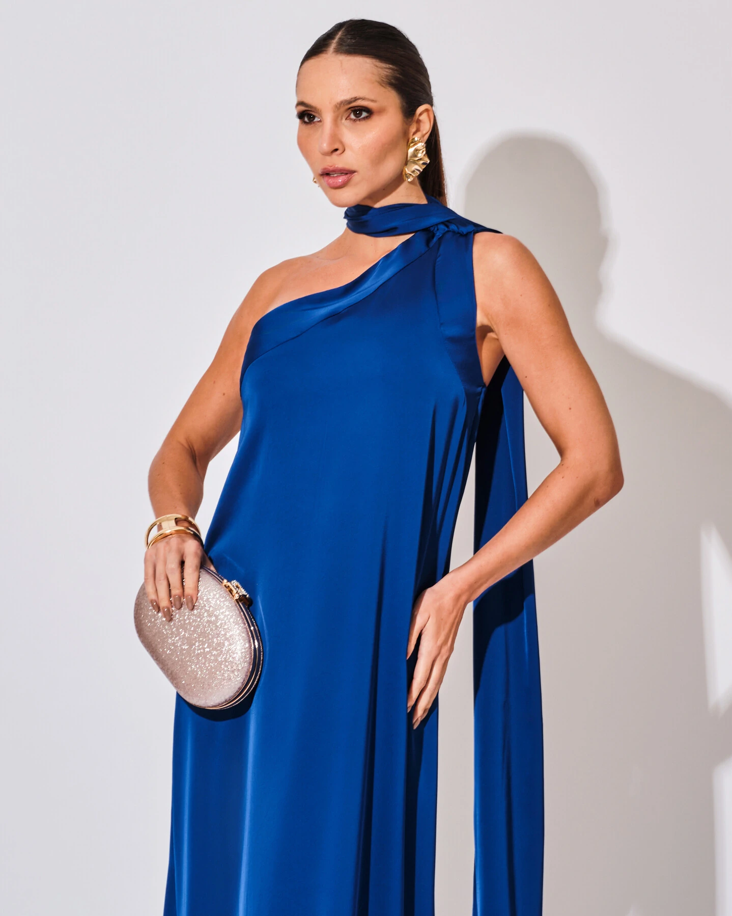 Vestido de Festa Longo Cetim Fluido Um Ombro Só Lenço Fixo Azul Royal